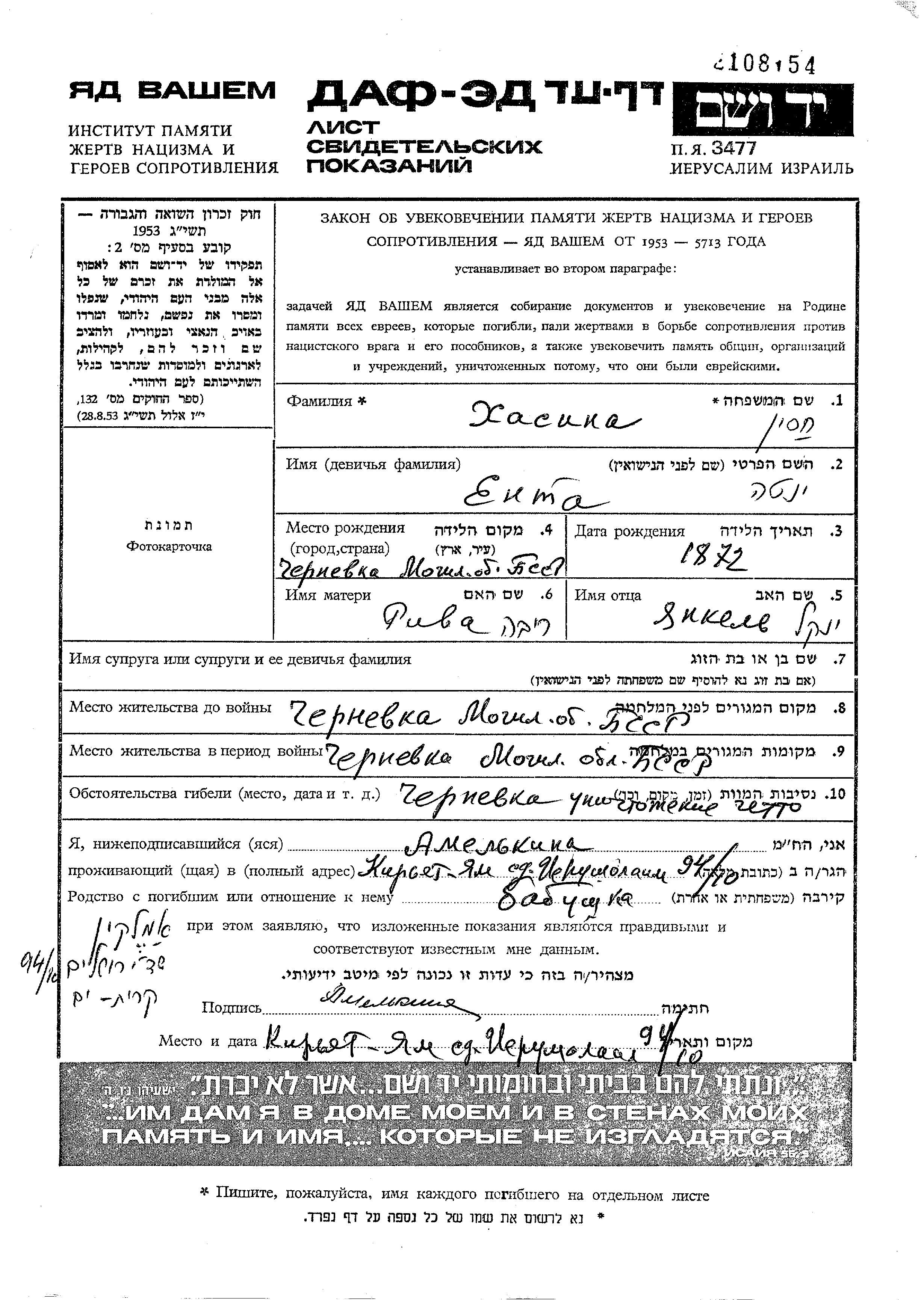 Yenta Khasin Khesin was born in Chernevka, Belorussia (USSR) to Yankel and Riva. Prior to WWII she lived in Chernevka, Belorussia (USSR). During the war she was in Chernevka, Belorussia (USSR). Yenta was murdered in the Shoah. Place of death: Chernevka, Belorussia (USSR).