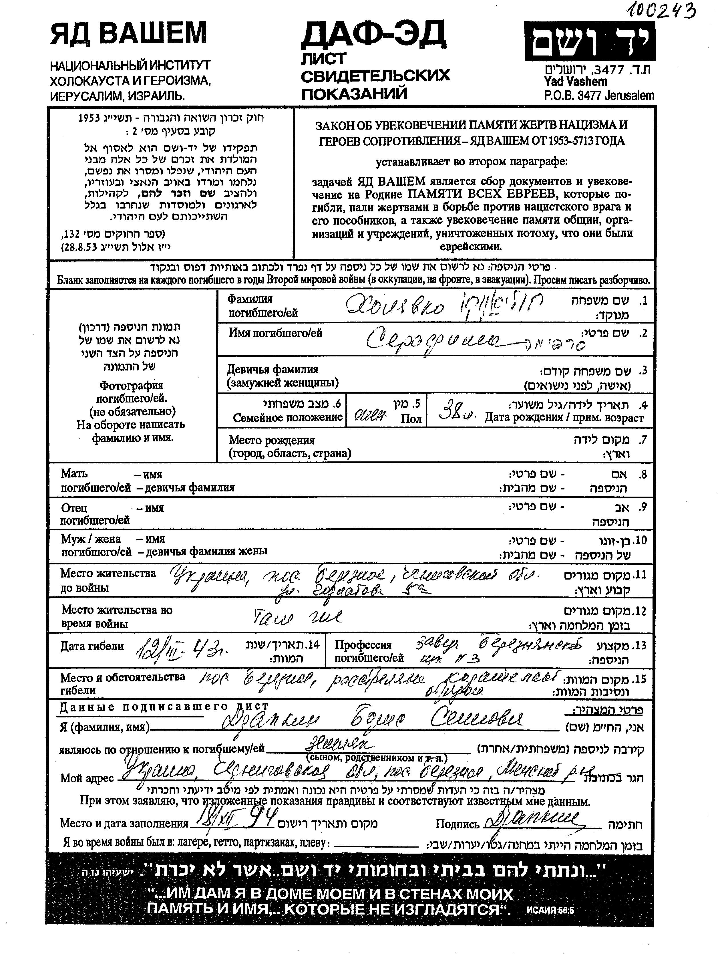 Kholyavko Serafima 1905 Berezna, Ukraine (USSR) Page of Testimony
