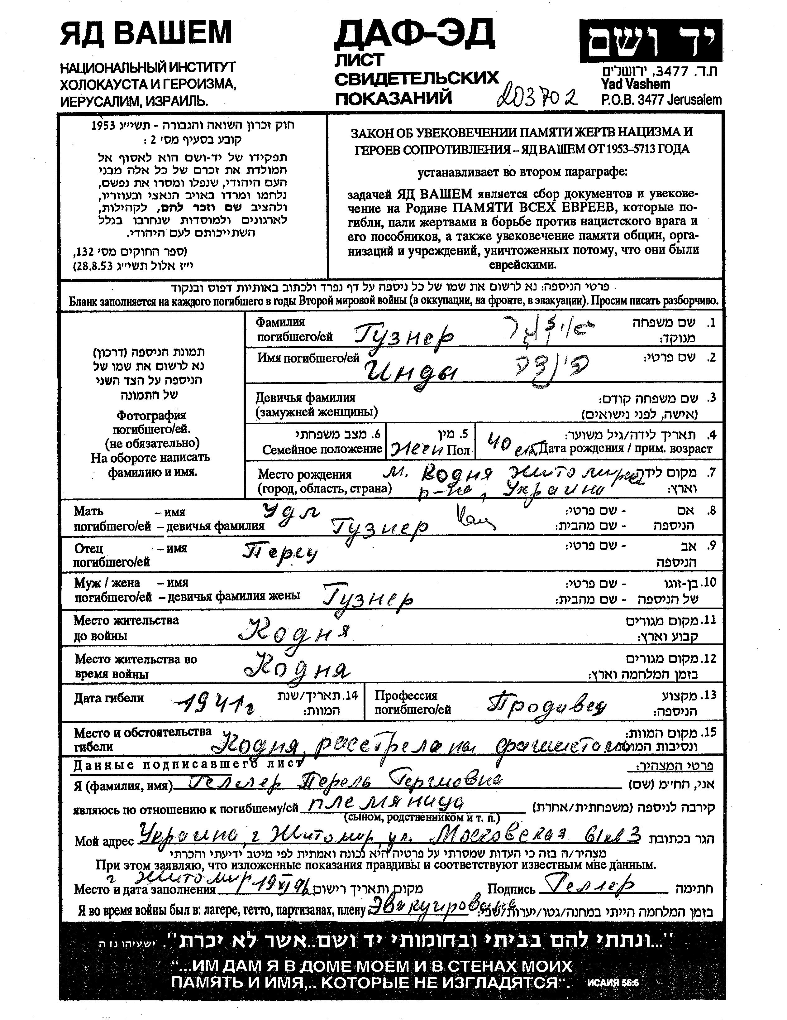 Indy Guzner was born in Kodnya, Ukraine (USSR), 1901 to Peretz and Udl Udel nee Katz. She was a sales person and married. Prior to WWII she lived in Kodnya, Ukraine (USSR). During the war she was in Kodnya, Ukraine (USSR). Indy was murdered in the Shoah. Place of death: Kodnya, Ukraine (USSR), 1941.