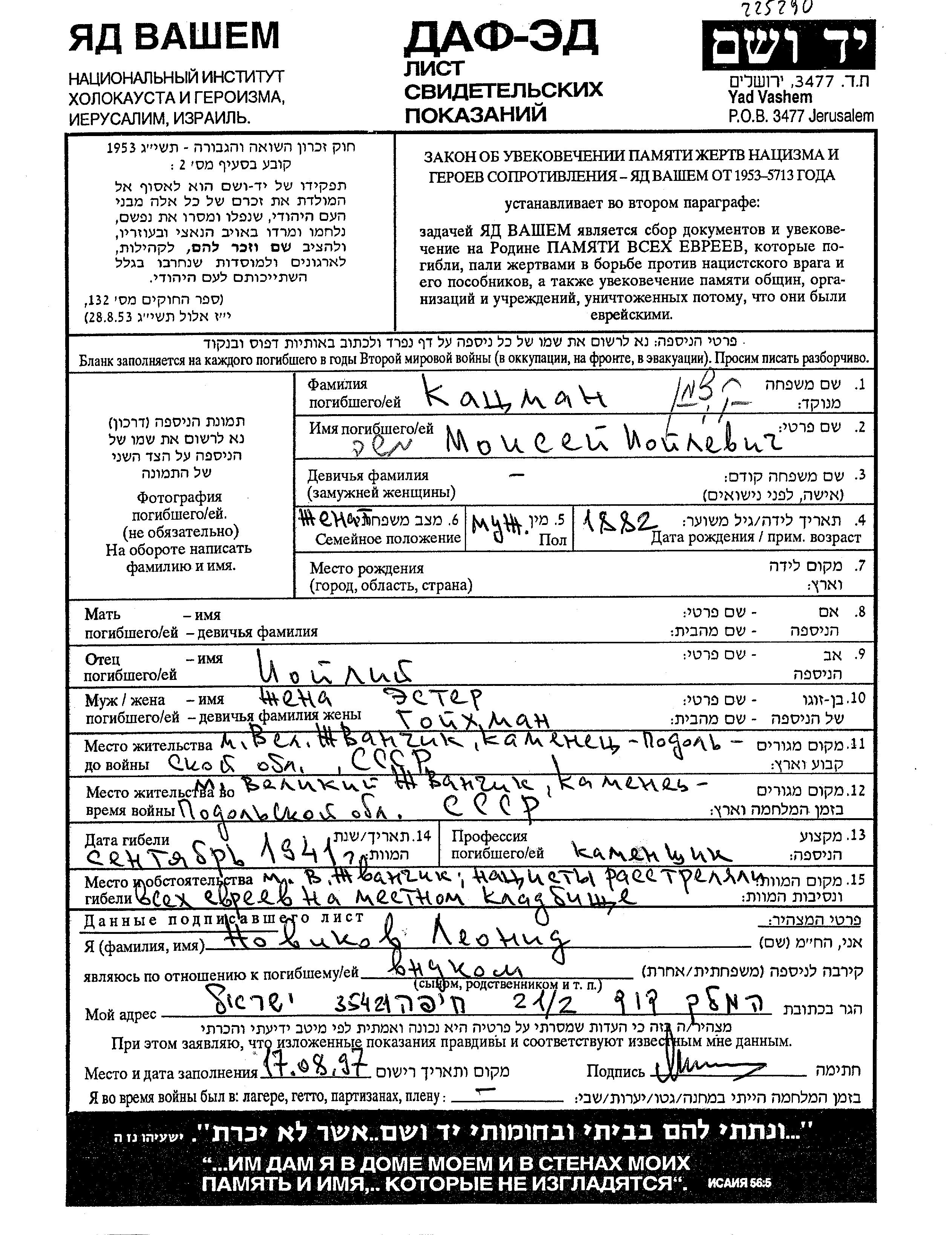 Moisei Katzman was born, 1882 to Ioyli Yoel. He was a builder and married to Ester. Prior to WWII he lived in Velikiy Zhvanchik, Ukraine (USSR). During the war he was in Velikiy Zhvanchik, Ukraine (USSR). Moisei was murdered in the Shoah. Place of death: Velikiy Zhvanchik, Ukraine (USSR), 1941.