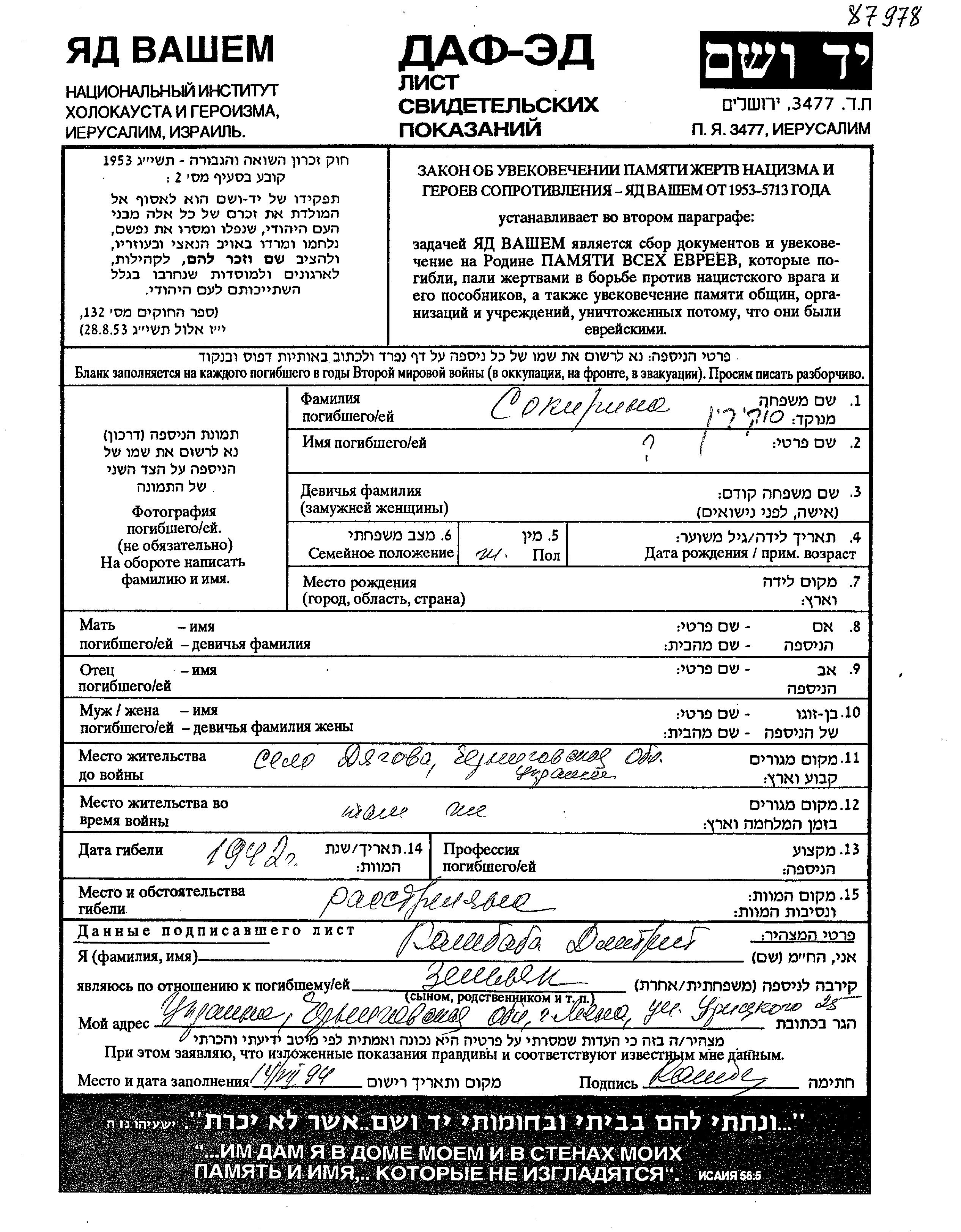 First name unknown Sokirina. Prior to WWII she lived in Dyagova, Ukraine (USSR). During the war she was in Dyagova, Ukraine (USSR). She was murdered in the Shoah. Place of death: unknown, 1942.