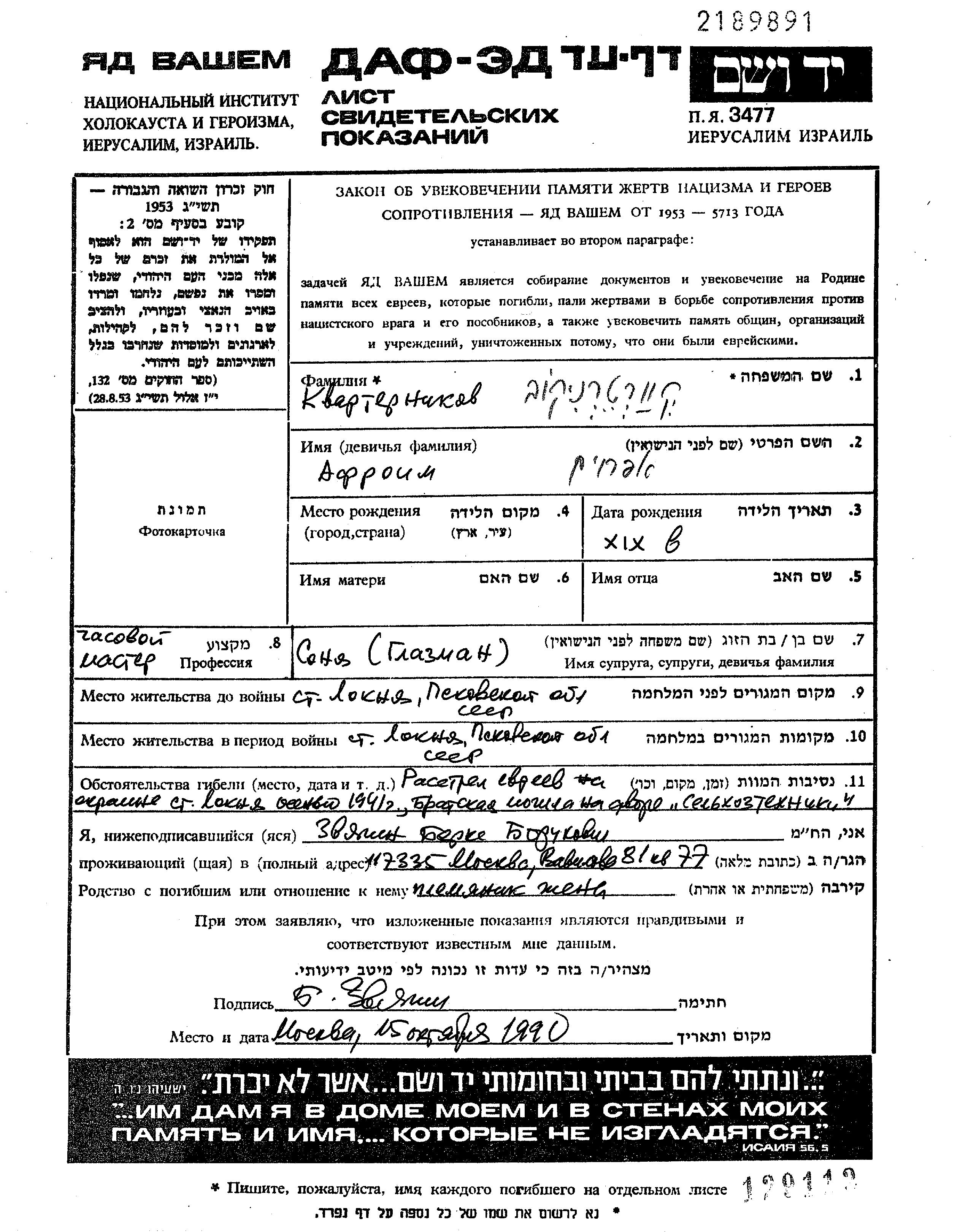 Afroim Kvarternikov was born, 1919. He was a watchmaker and married to Sonia. Prior to WWII he lived in Loknya, Russia (USSR). During the war he was in Loknya, Russia (USSR). Afroim was murdered in the Shoah. Place of death: Loknya, Russia (USSR), 1941.