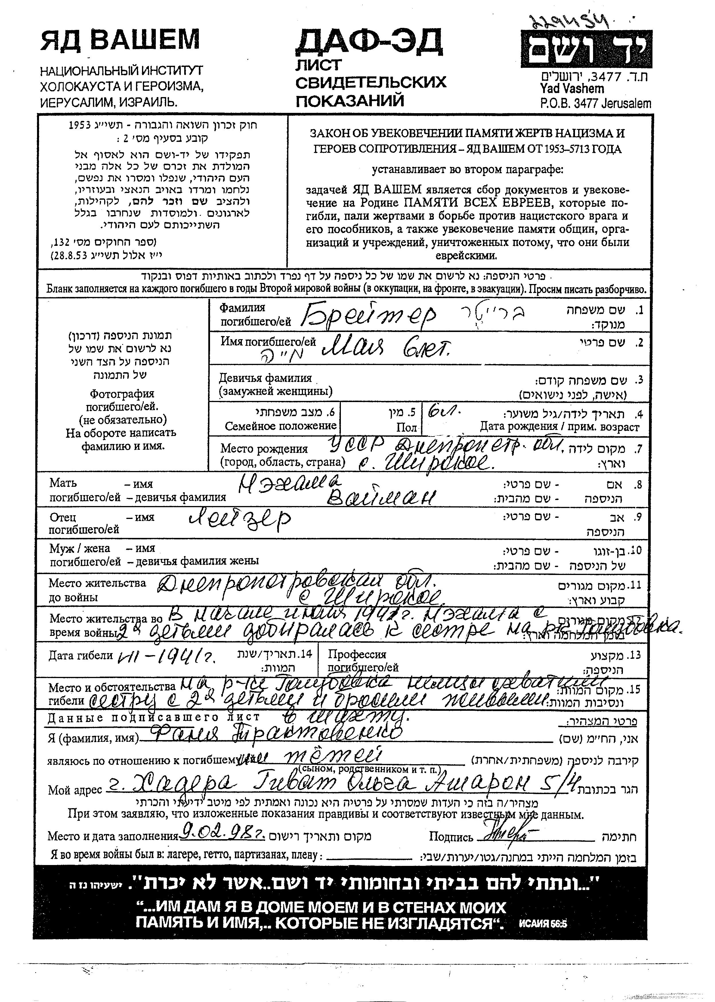 Maya Breiter was born in Shirokoye, Ukraine (USSR), 1935 to Leizer and Nekhama nee Vaiman. She was child. Prior to WWII she lived in Shirokoye, Ukraine (USSR). Maya was murdered in the Shoah. Place of death: Golubovka, Ukraine (USSR), 1941.