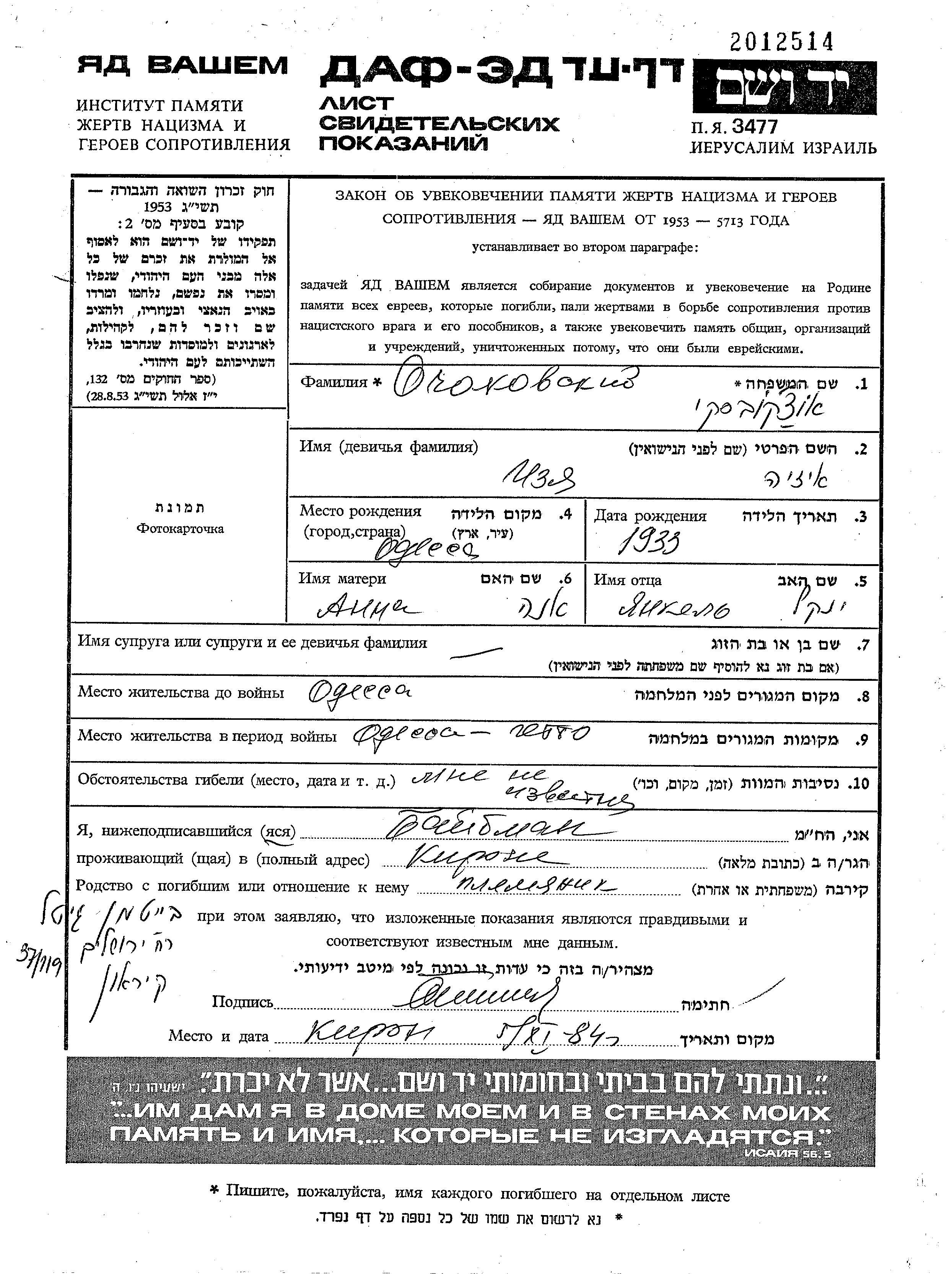 Ochakovski Izia 1933 Odessa, Ukraine (USSR) Page of Testimony