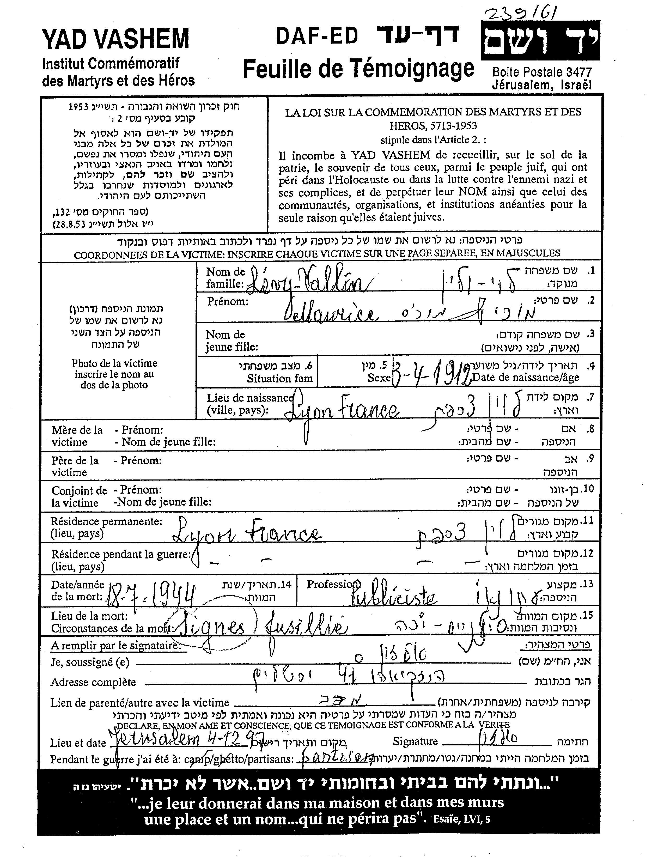 Levy Vallin Maurice 1912 Lyon, France Page of Testimony