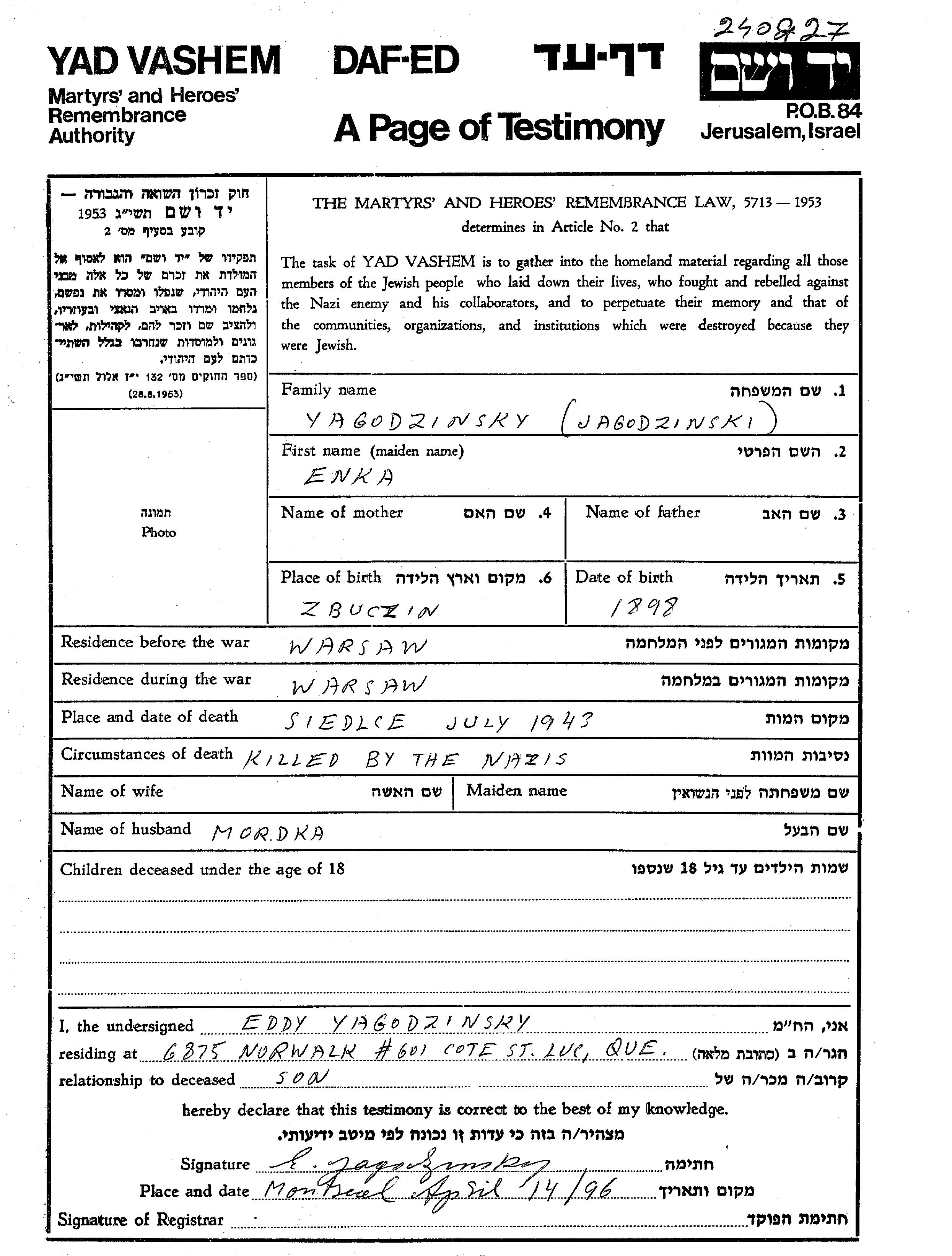 Enka Yagodzinsky was born in Zbuczyn, Poland, 1898. She was married to Mordka. Prior to WWII she lived in Warszawa, Poland. During the war she was in Warszawa, Poland. Enka was murdered in the Shoah. Place of death: Siedlce, Poland, 1943.