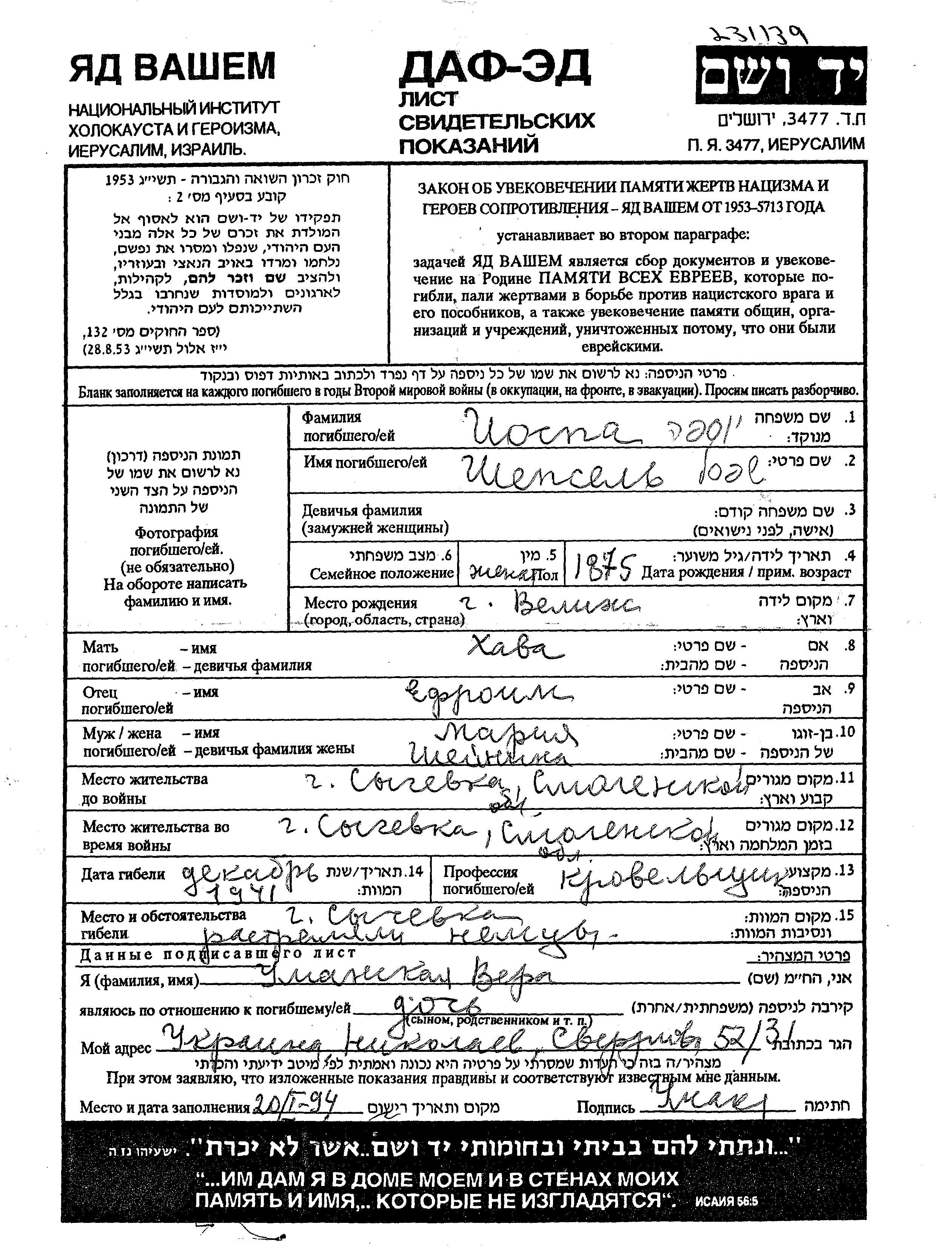 Shepsel Iospa was born in Velizh, Russia (USSR), 1875 to Efroim and Khava. He was a roof repairer and married to Maria. Prior to WWII he lived in Sychevka, Russia (USSR). During the war he was in Sychevka, Russia (USSR). Shepsel was murdered in the Shoah. Place of death: Sychevka, Russia (USSR), 1941.