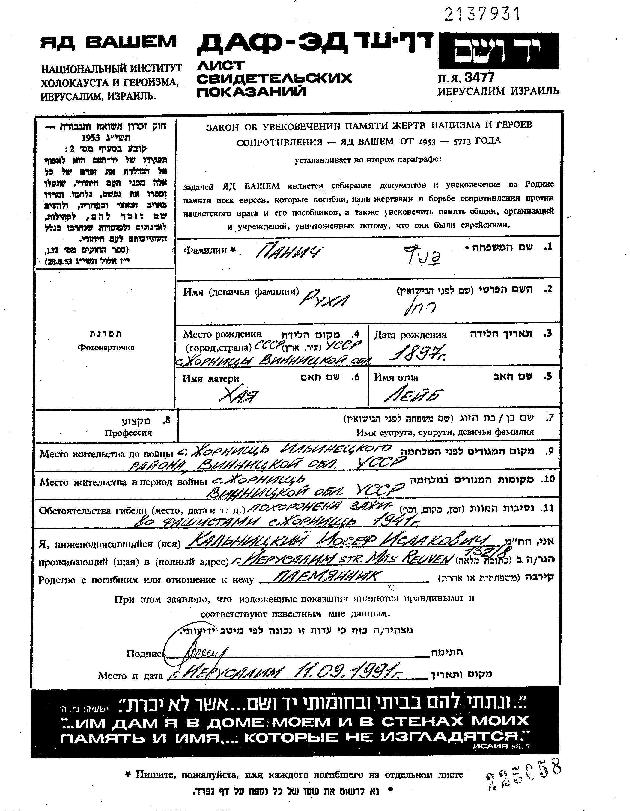 Panich Rukhl Zhornishche, Ukraine (USSR) Page of Testimony