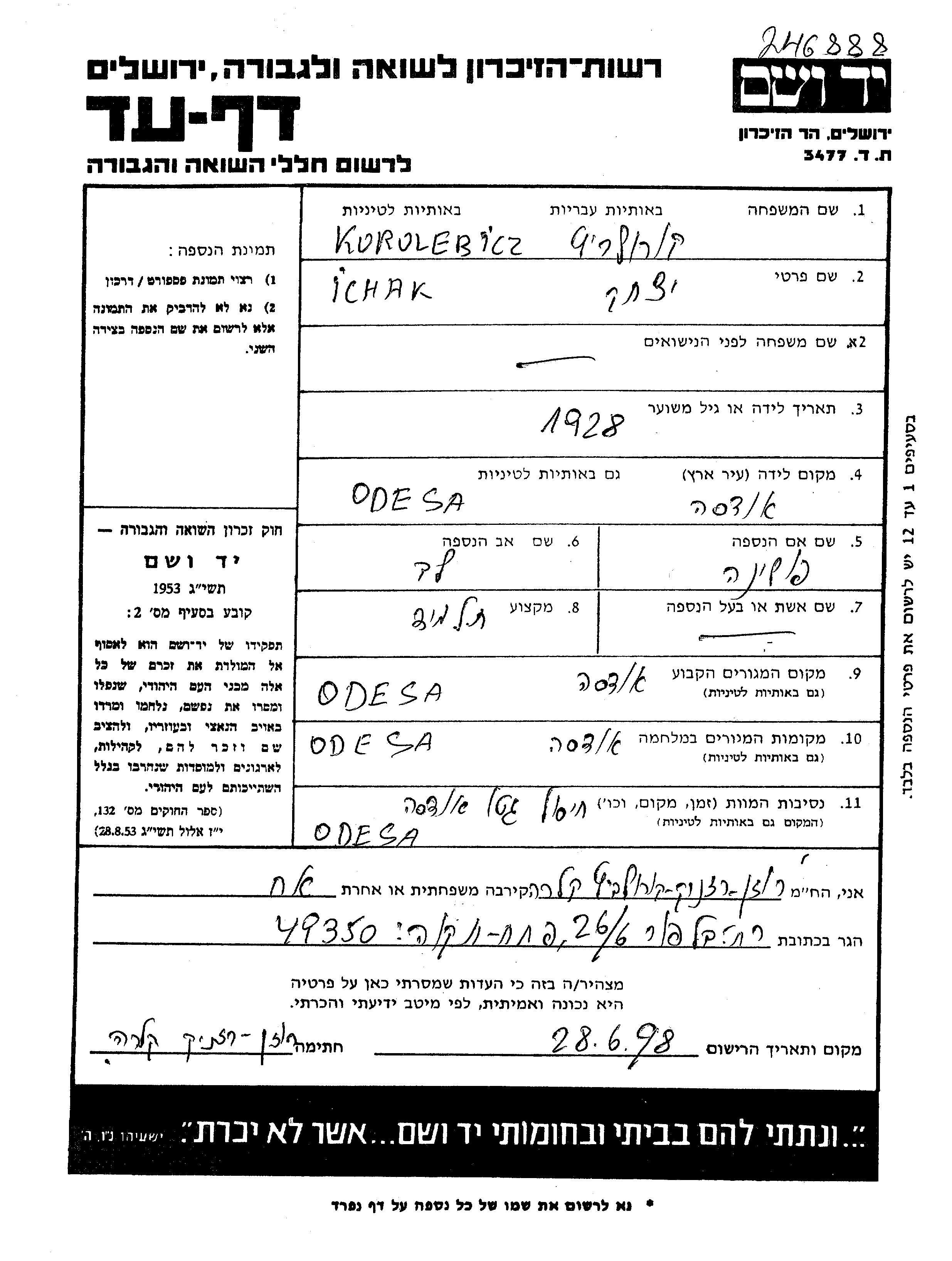 Ichak Korolewicz was born in Odessa, Ukraine (USSR), 1928 to Leb Lev and Pola nee Akunevich. He was a pupil and child. Prior to WWII he lived in Odessa, Ukraine (USSR). During the war he was in Odessa, Ukraine (USSR). Ichak was murdered in the Shoah. Place of death: Odessa, Ukraine (USSR).