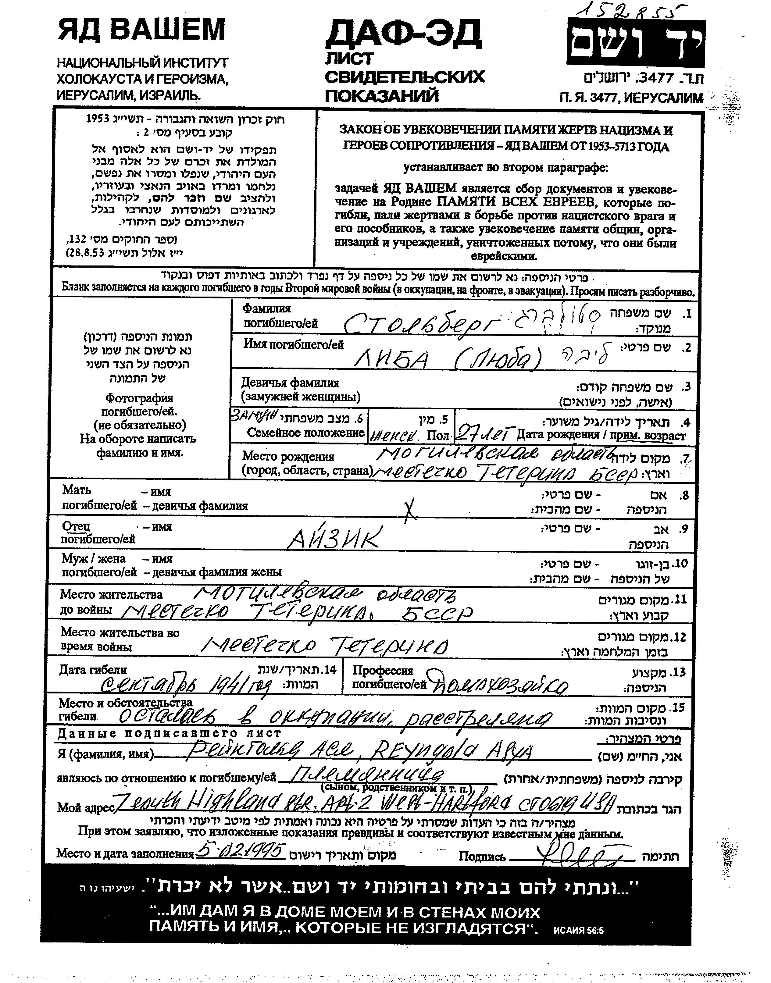 Stolberg Liba Liuba 1914 Teterin, Belorussia (USSR) Page of Testimony