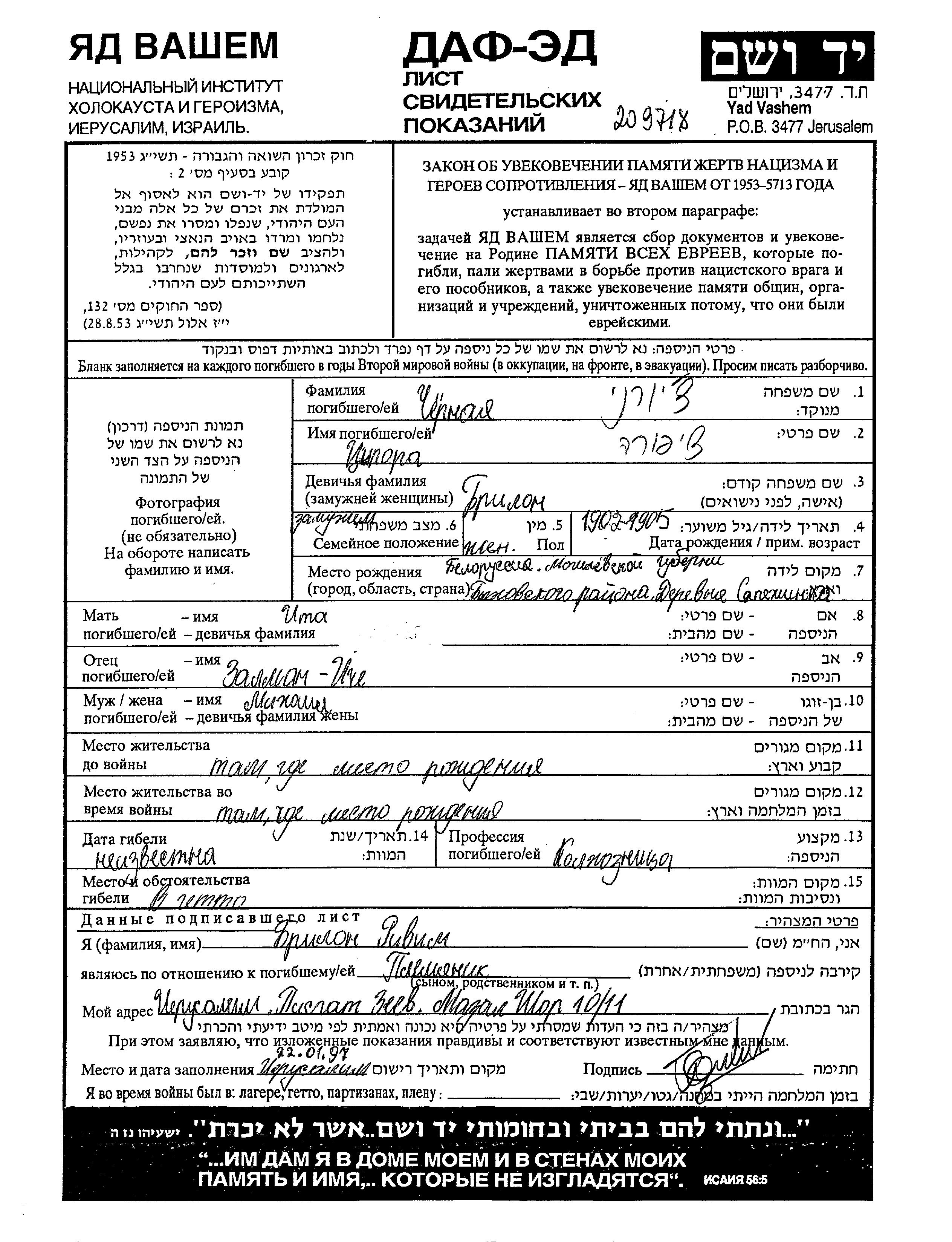 Tzipora Chyorny Charni nee Brilon was born in Sapezhinka, Belorussia (USSR), 1902 to Zalman Iche and Ita. She was a kolkhoznik / kolkhoznitza and married to Mikhail. Prior to WWII she lived in Sapezhinka, Belorussia (USSR). During the war she was in Sapezhinka, Belorussia (USSR). Tzipora was murdered in the Shoah.