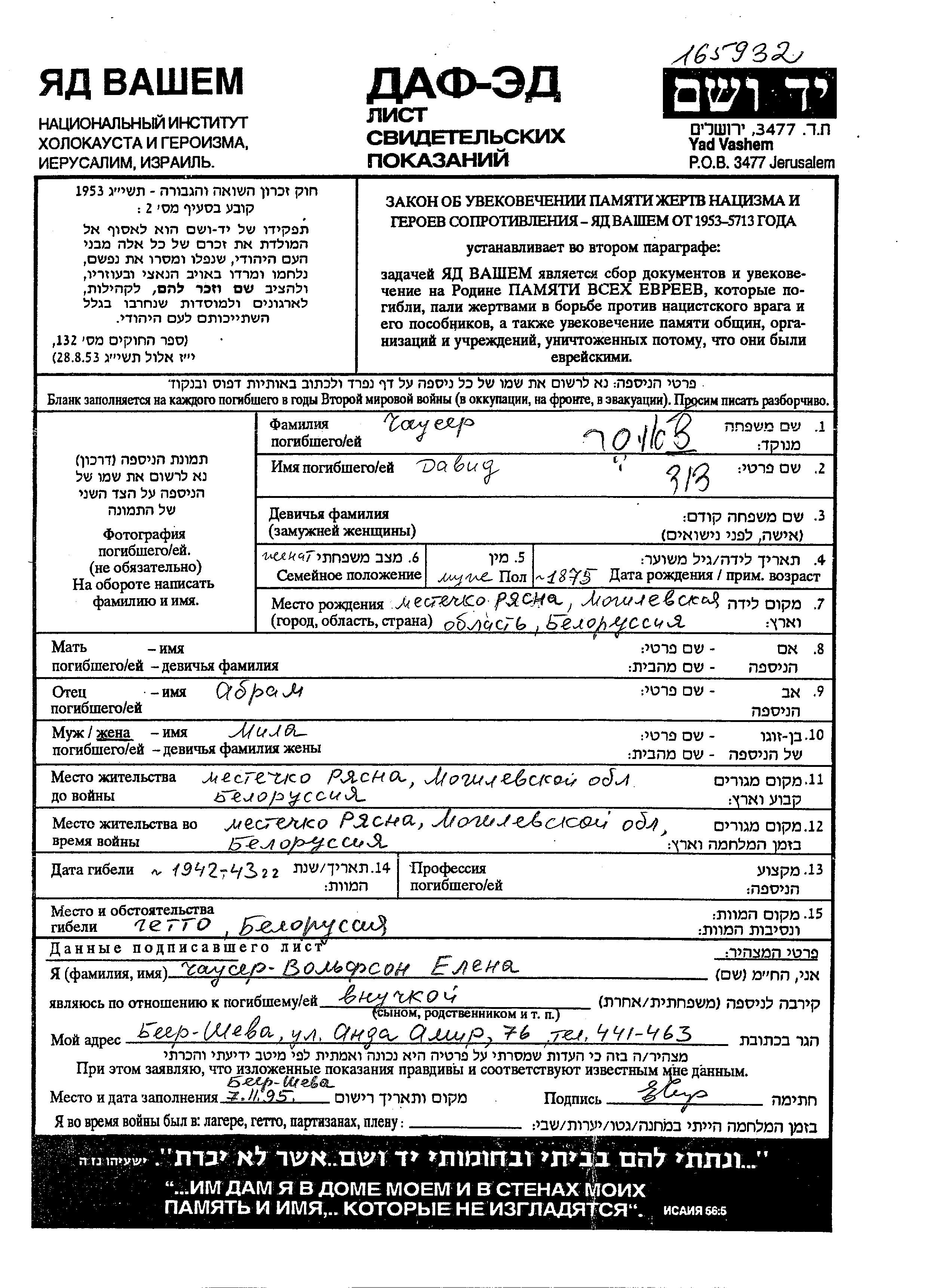 Chauser David 1875 Ryasna, Belorussia (USSR) Page of Testimony