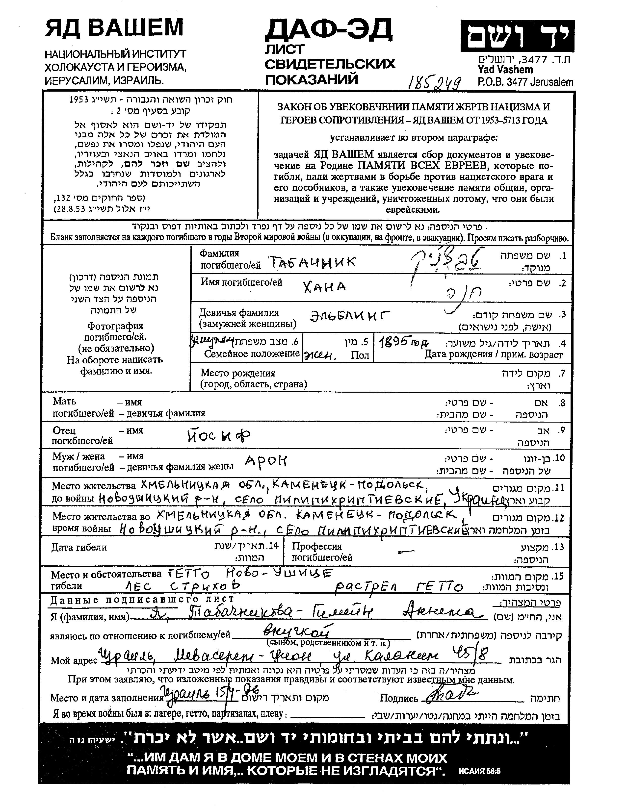 Tabachnik Khana Pilipy Khrebtiyevskiye, Ukraine (USSR) Page of Testimony