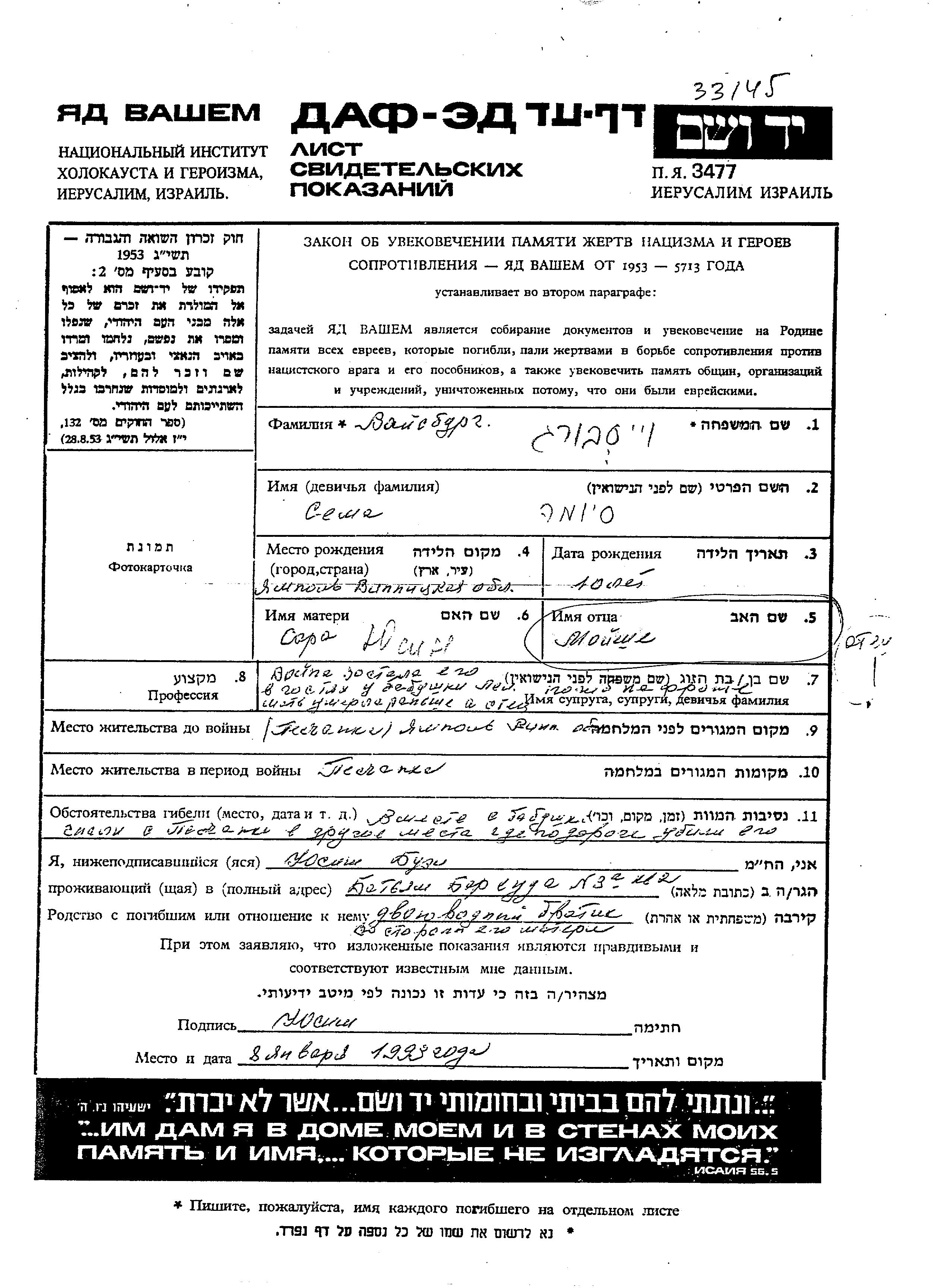 Moishe Vaisburg. He was married to Sara. Prior to WWII he lived in Yampol, Ukraine (USSR). During the war he was in the Soviet armed forces. Moishe was killed in military service in WWII.