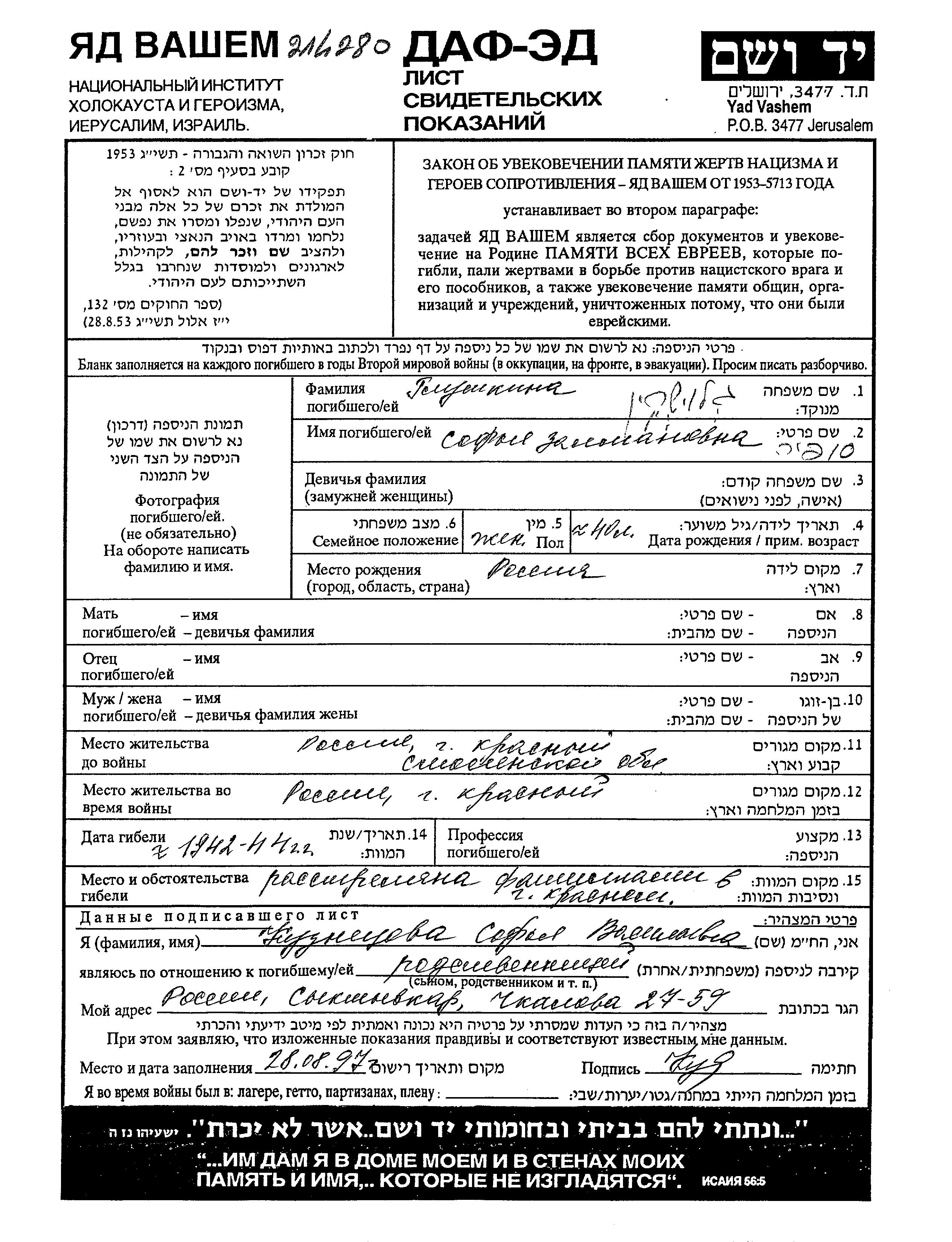 Sofia Glushkin Galushkin was born in Russia (USSR) to Zalman. Prior to WWII she lived in Krasnoye, Russia (USSR). During the war she was in Krasnoye, Russia (USSR). Sofia was murdered in the Shoah. Place of death: Krasnoye, Russia (USSR).