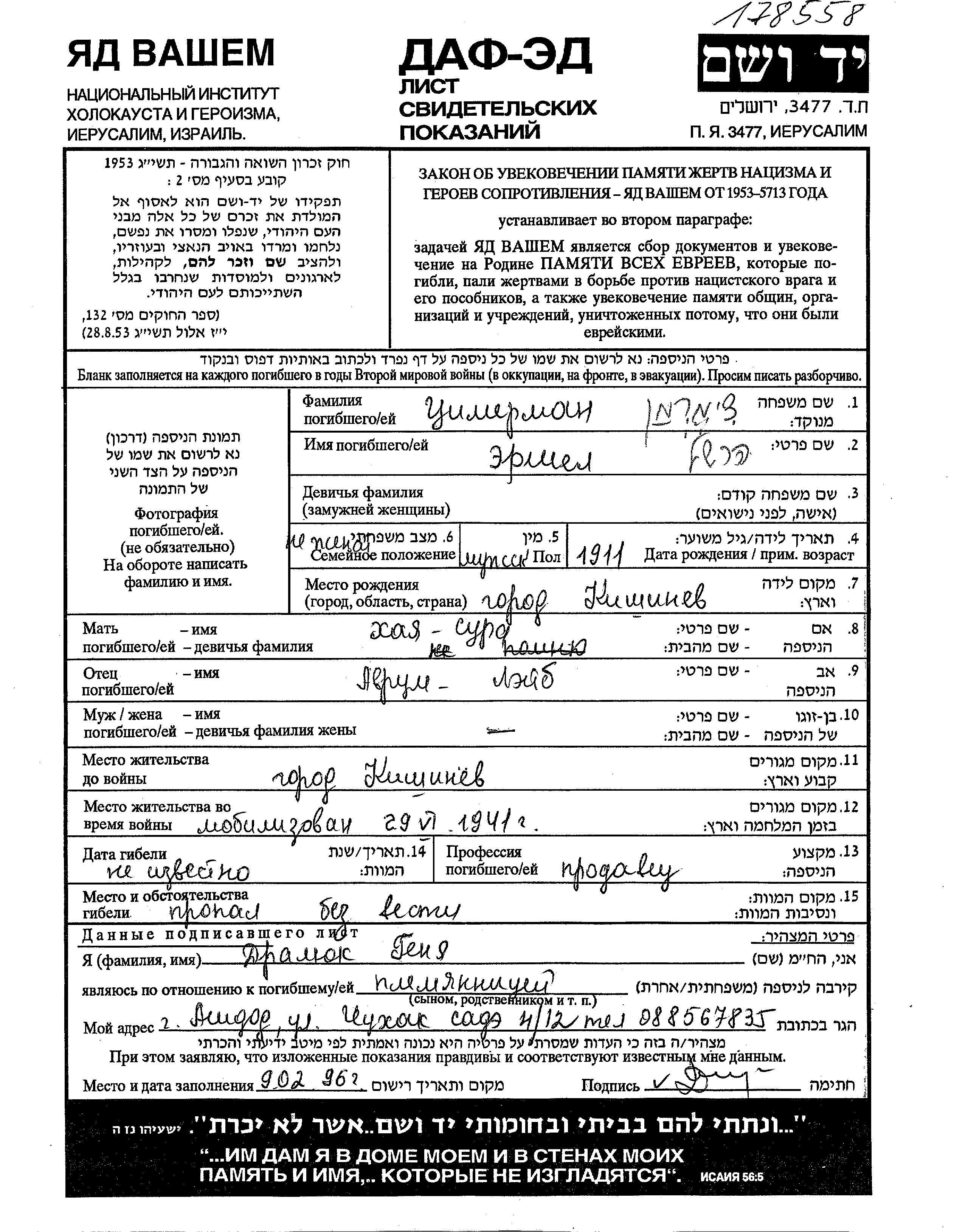 Ershel Tzimerman was born in Kishinev, Romania, 1911 to Avrum Leib and Khaia Sura. He was a sales person and single. Prior to WWII he lived in Kishinev, Romania. During the war he was in the Soviet armed forces. Ershel was murdered in the Shoah.