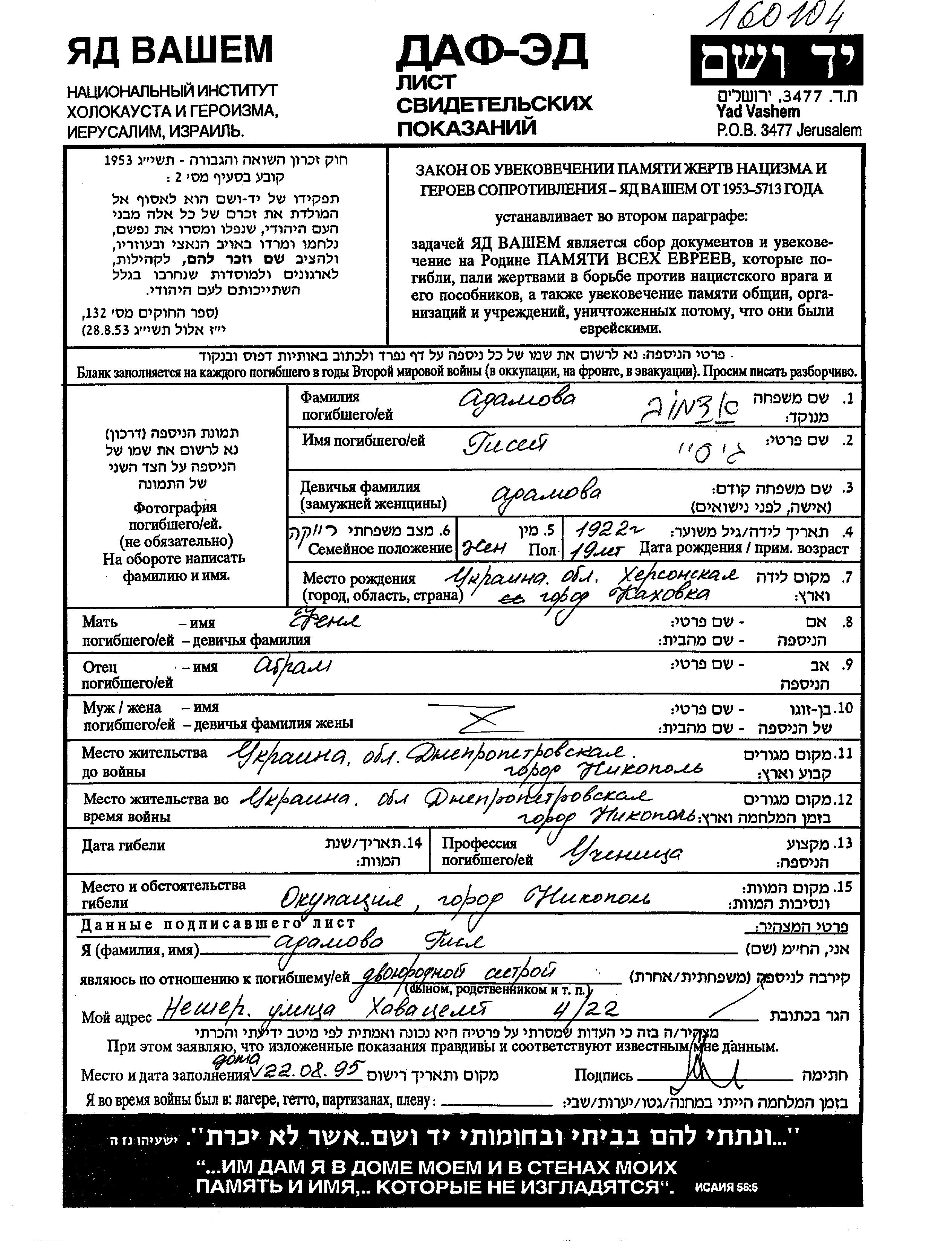 Gisei Adamov was born in Kakhovka, Ukraine (USSR), 1922 to Abram and Fenia. He was a pupil and single. Prior to WWII he lived in Nikopol, Ukraine (USSR). During the war he was in Nikopol, Ukraine (USSR). Gisei was murdered in the Shoah. Place of death: Nikopol, Ukraine (USSR).