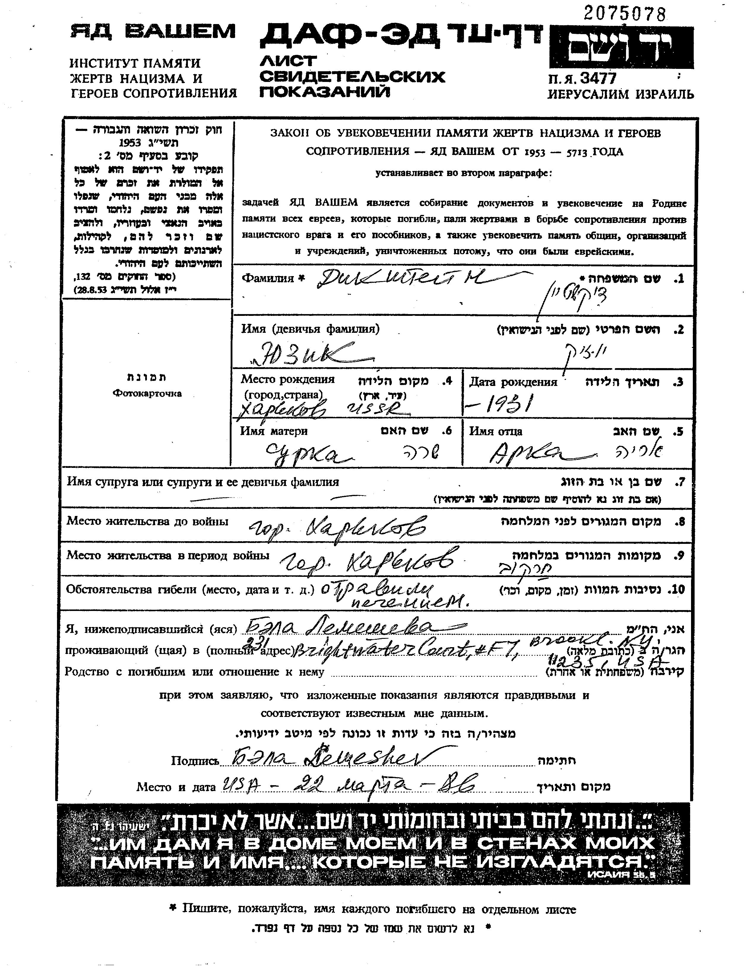Yuzik was murdered in the Shoah. Place of death: Kharkov, Ukraine (USSR).