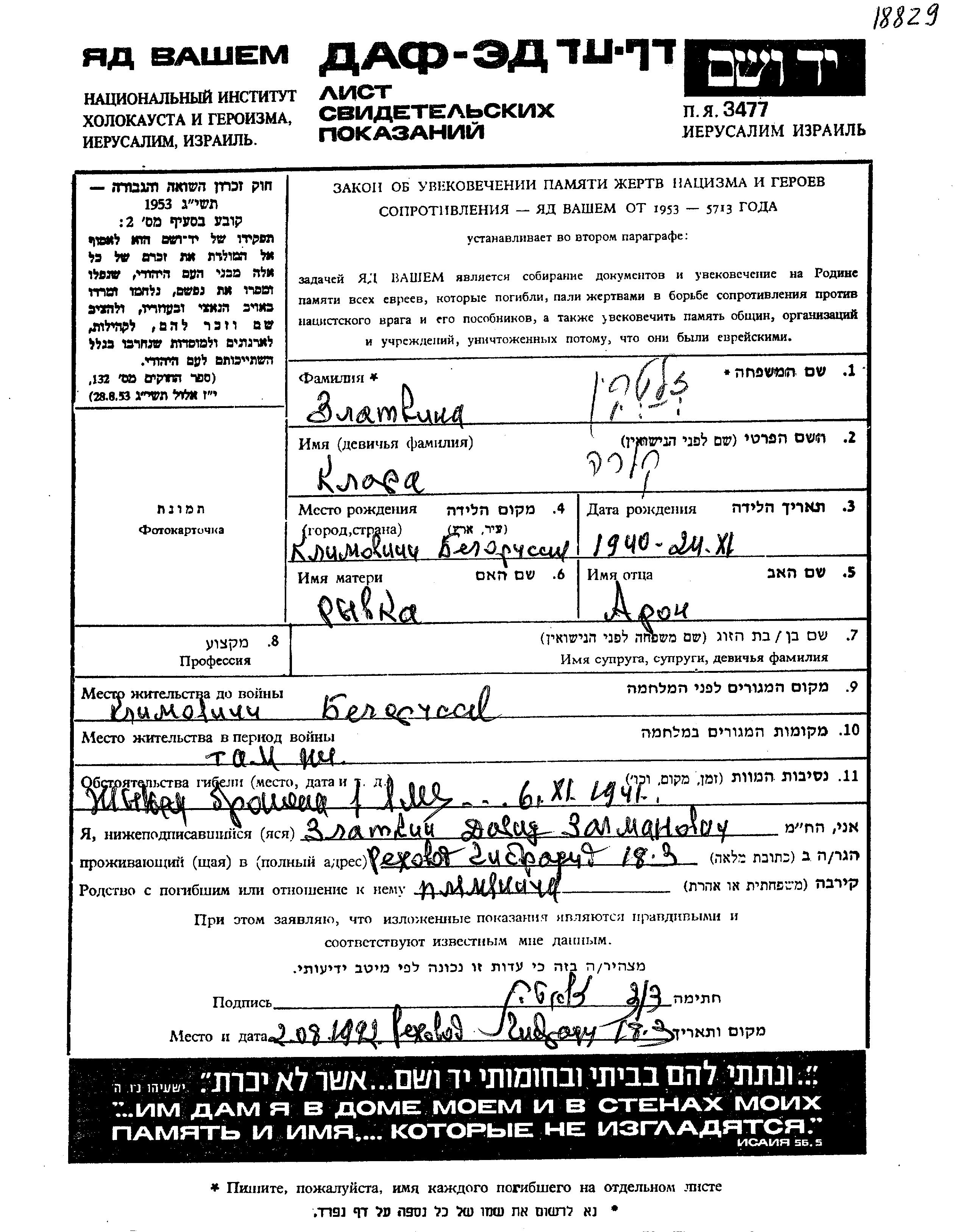 Zlatkin Klara 1940 Klimovichi, Belorussia (USSR) Page of Testimony
