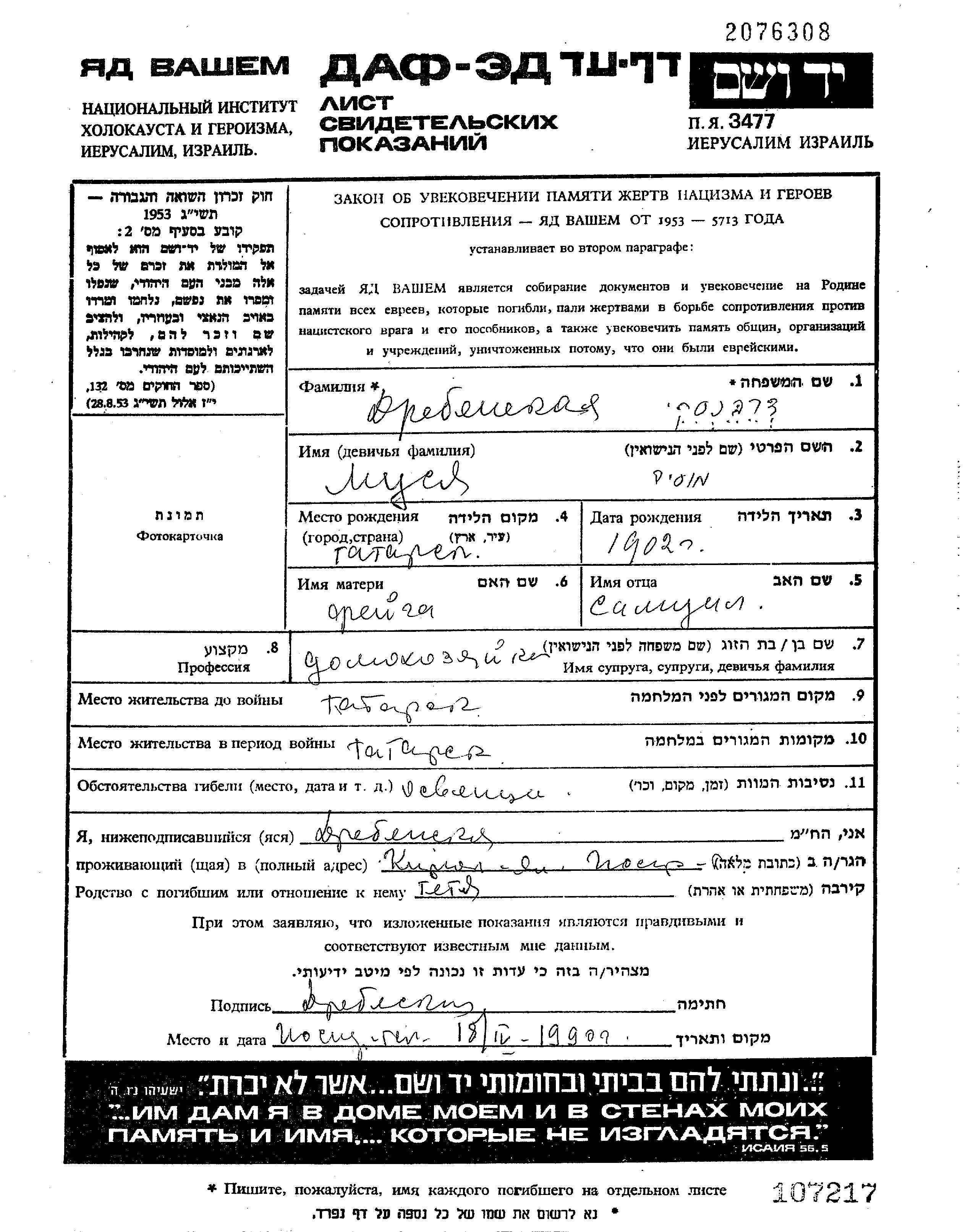 Drebenski Musya 1902 Tatarsk, Russia (USSR) Page of Testimony