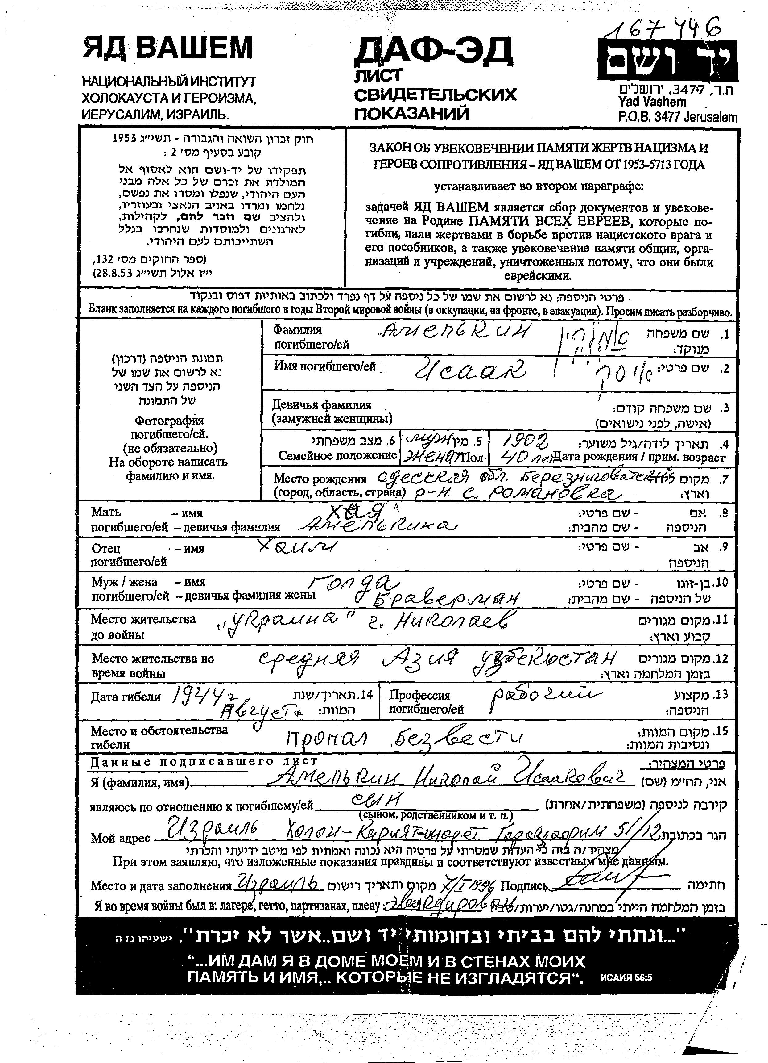 Isaak Amelkin was born in Romanovka, Ukraine (USSR), 1902 to Khaim and Khaia. He was a worker and married to Golda. Prior to WWII he lived in Nikolayev, Ukraine (USSR). During the war he was in the Soviet armed forces. Isaak was killed in military service in WWII. Place of death: unknown, 1944.