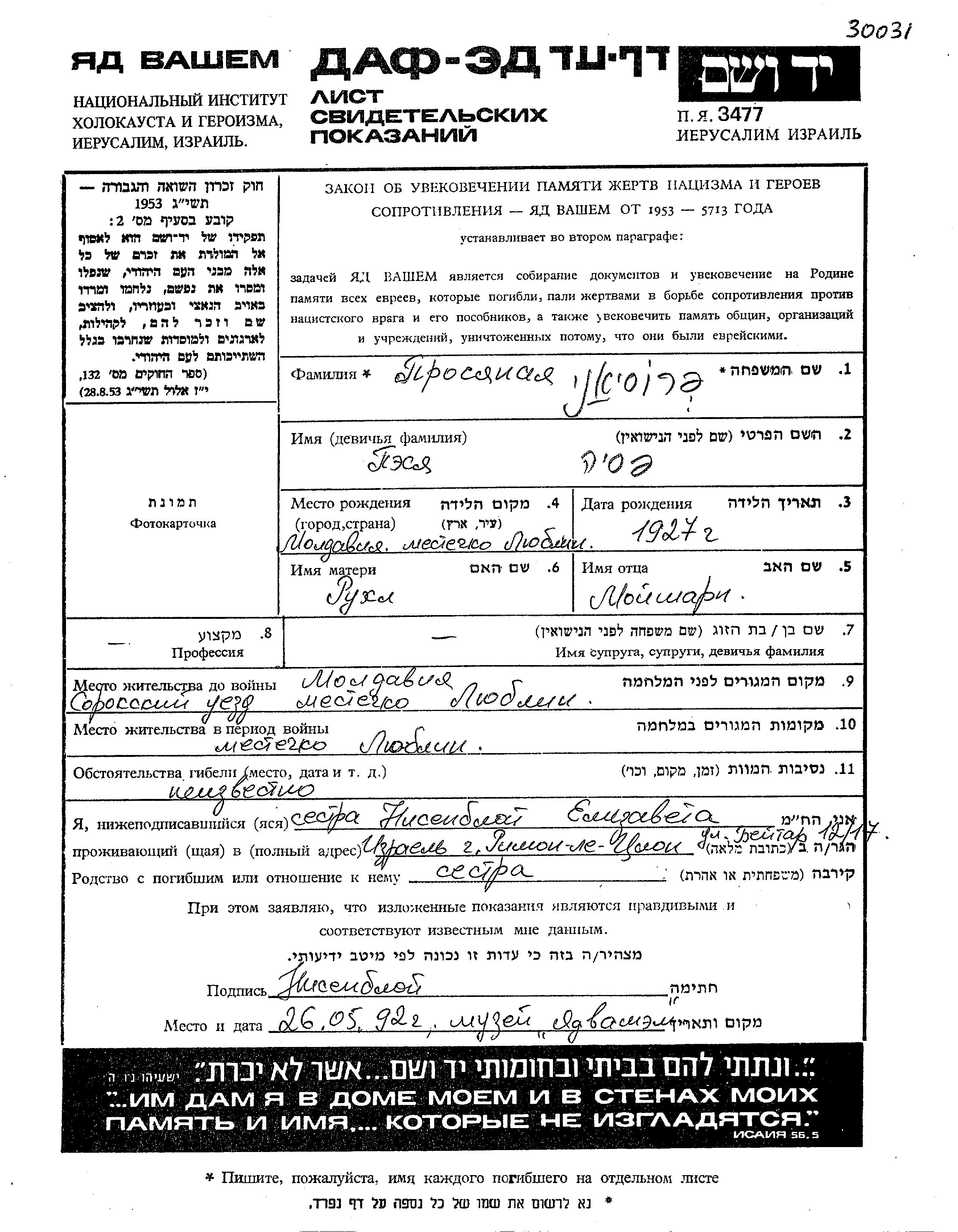 Pesia Prosyanaya was born in Liublin, Romania, 1927 to Moish Arn and Rukhl. Was child. Prior to WWII lived in Liublin, Romania. During the war was in Liublin, Romania. Pesia was murdered in the Shoah.