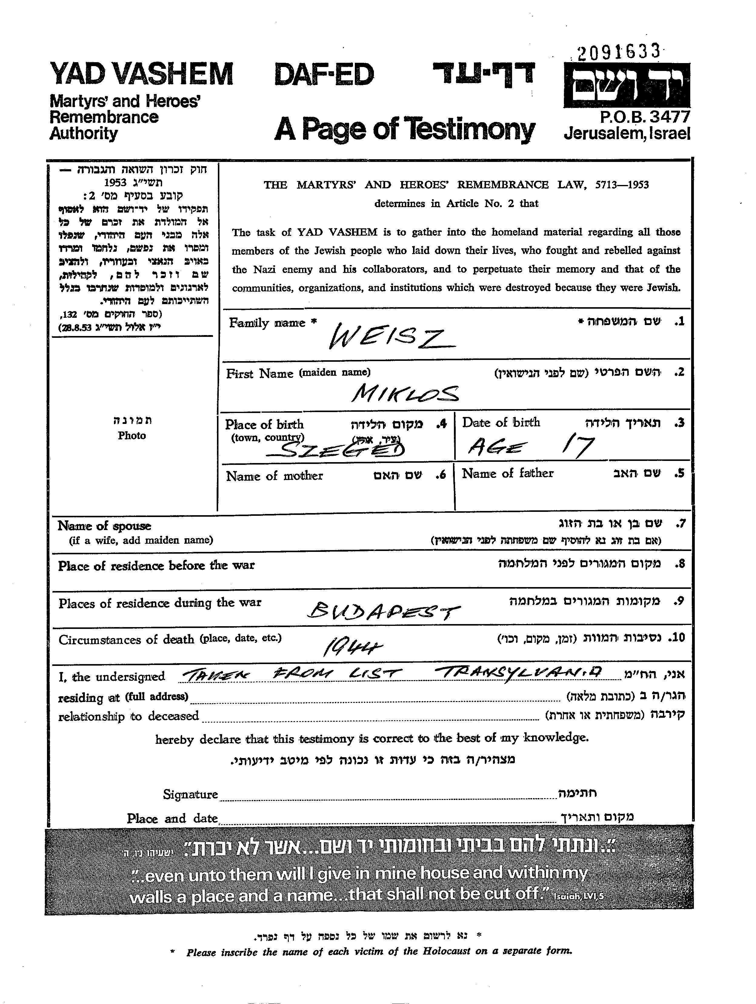 Yad Vashem - Pages of Testimony Names Memorial Collection
