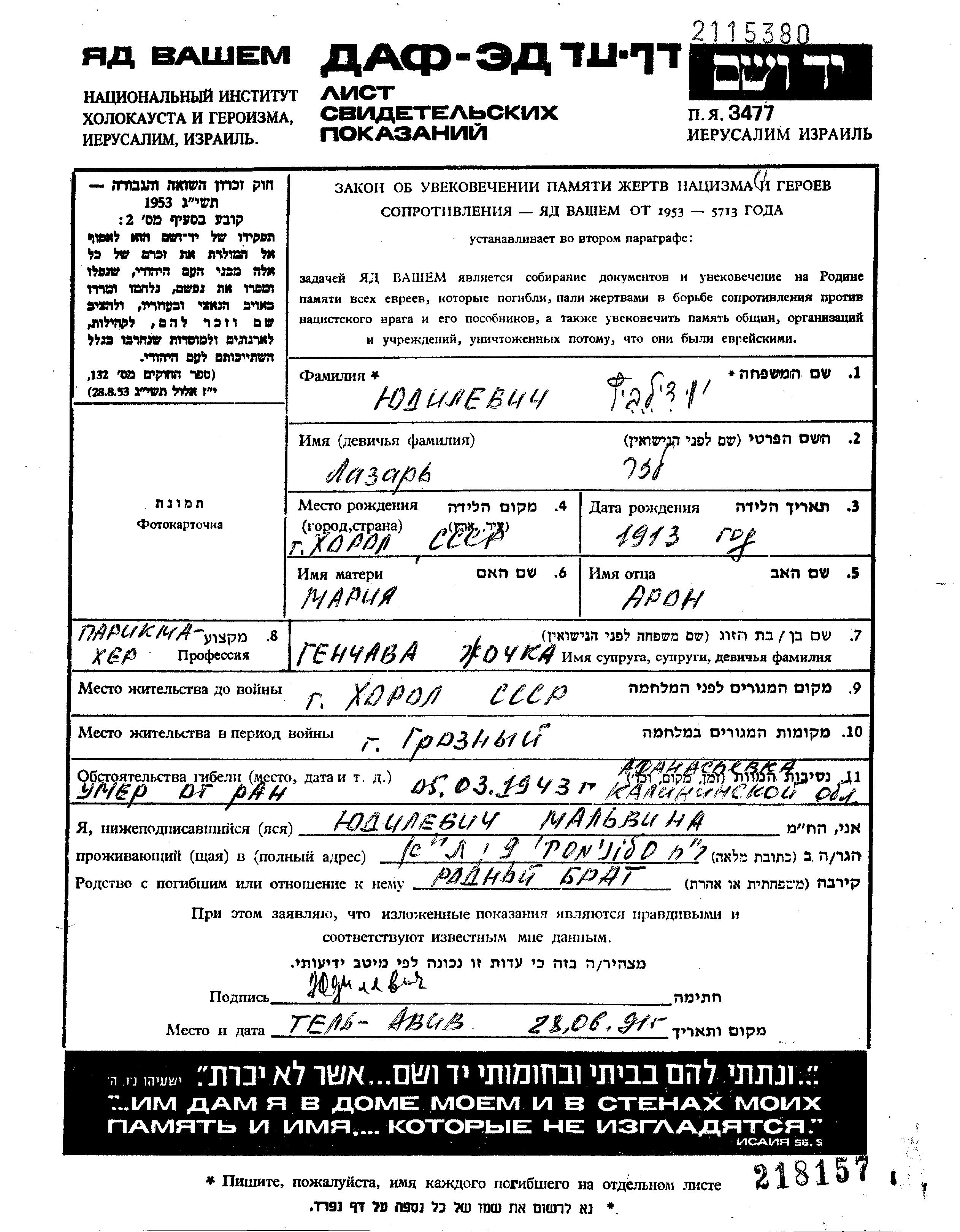 Yudilevich Lazar Khorol, Ukraine (USSR) Page of Testimony
