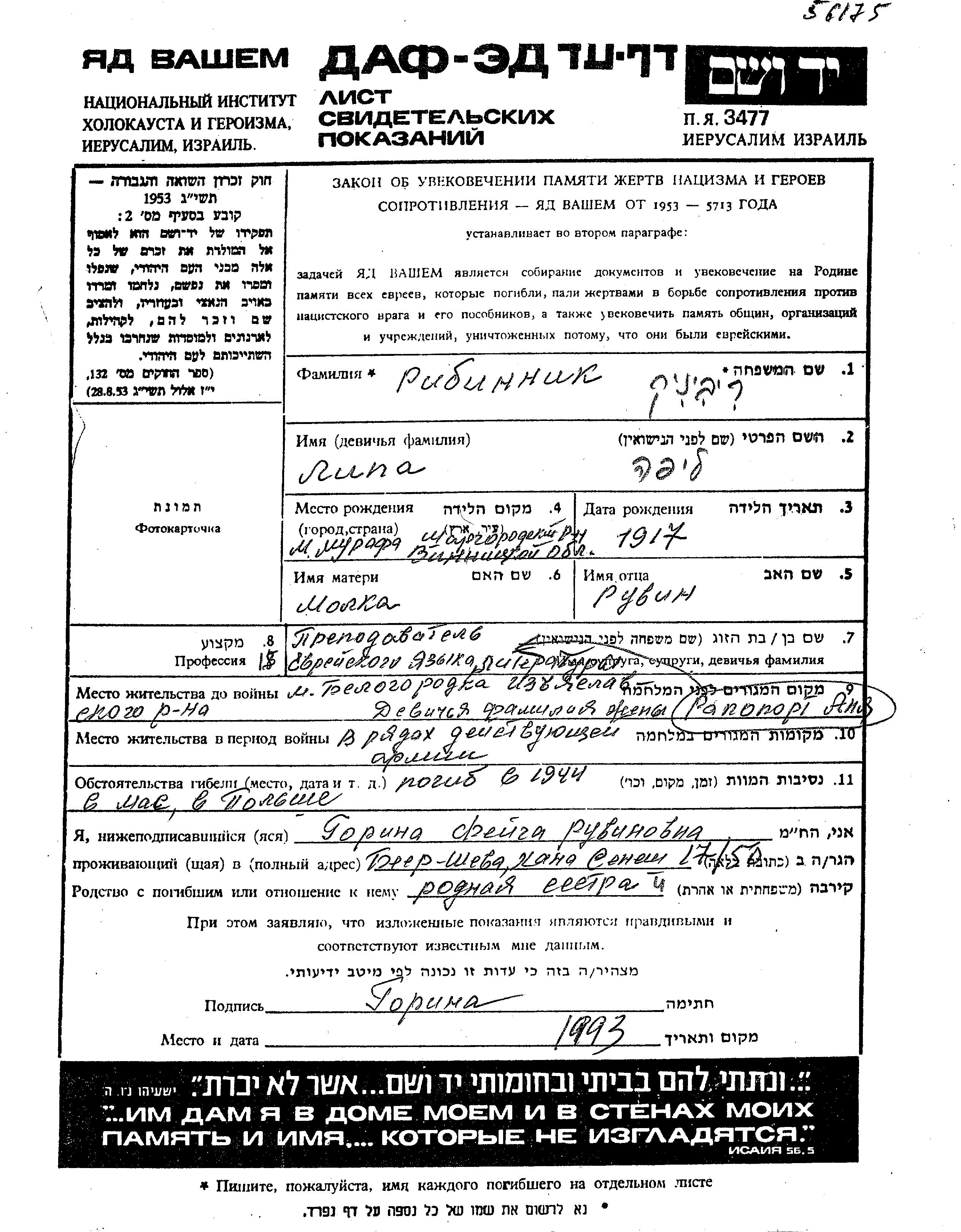 Lipa Ribinik was born in Murafa, Ukraine (USSR), 1917 to Ruvim and Malka. He was a teacher and married to Ania. Prior to WWII he lived in Belogorodka, Ukraine (USSR). During the war he was in the Soviet armed forces. Lipa was killed in military service in WWII. Place of death: Poland, 1944.