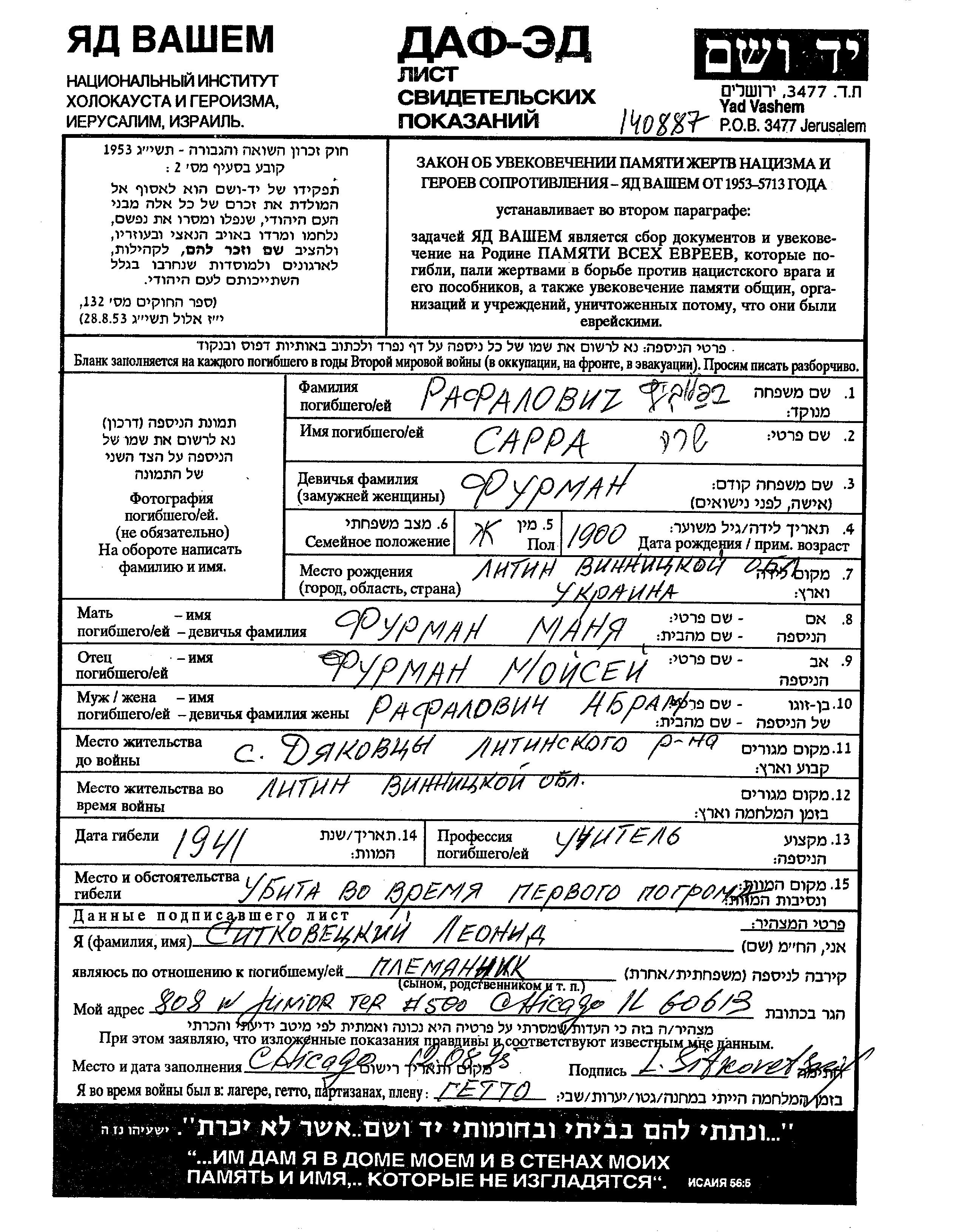 Sara Rafalovich nee Furman was born in Litin, Ukraine (USSR), 1900 to Moisei and Mania. She was a teacher and married to Abram. Prior to WWII she lived in Dyakovtsy, Ukraine (USSR). During the war she was in Litin, Ukraine (USSR). Sara was murdered in the Shoah. Place of death: unknown, 1941.