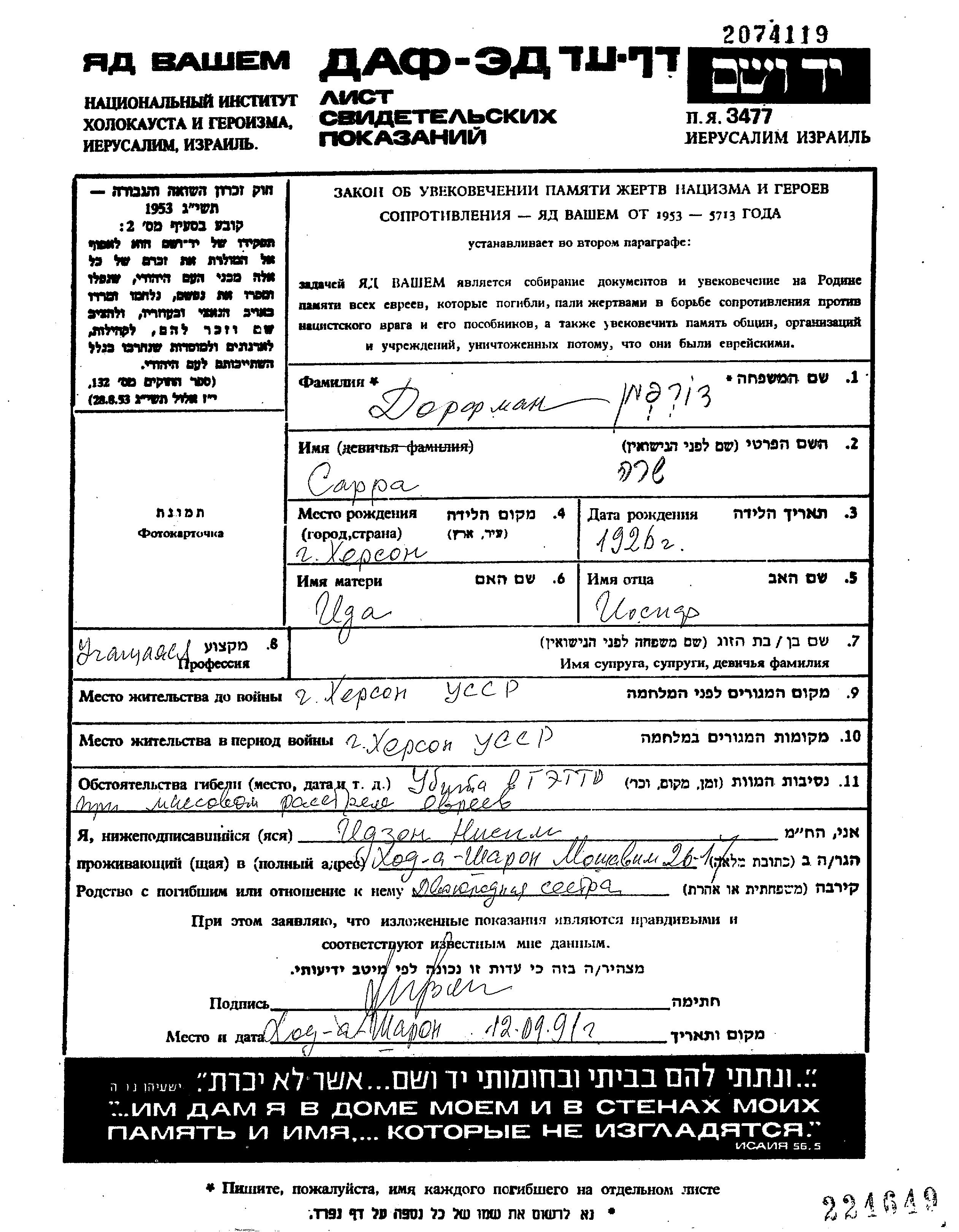 Dorfman Sara 1926 Kherson, Ukraine (USSR) Page of Testimony