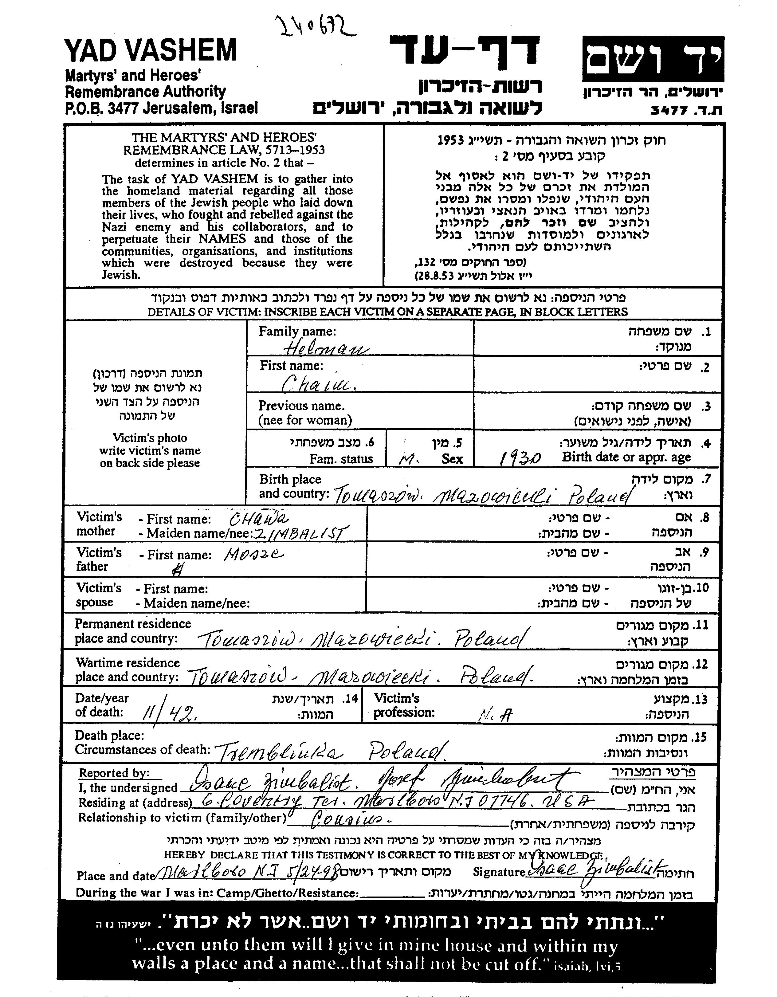 Helman Chaim 1930 Tomaszow Mazowiecki, Poland Page of Testimony