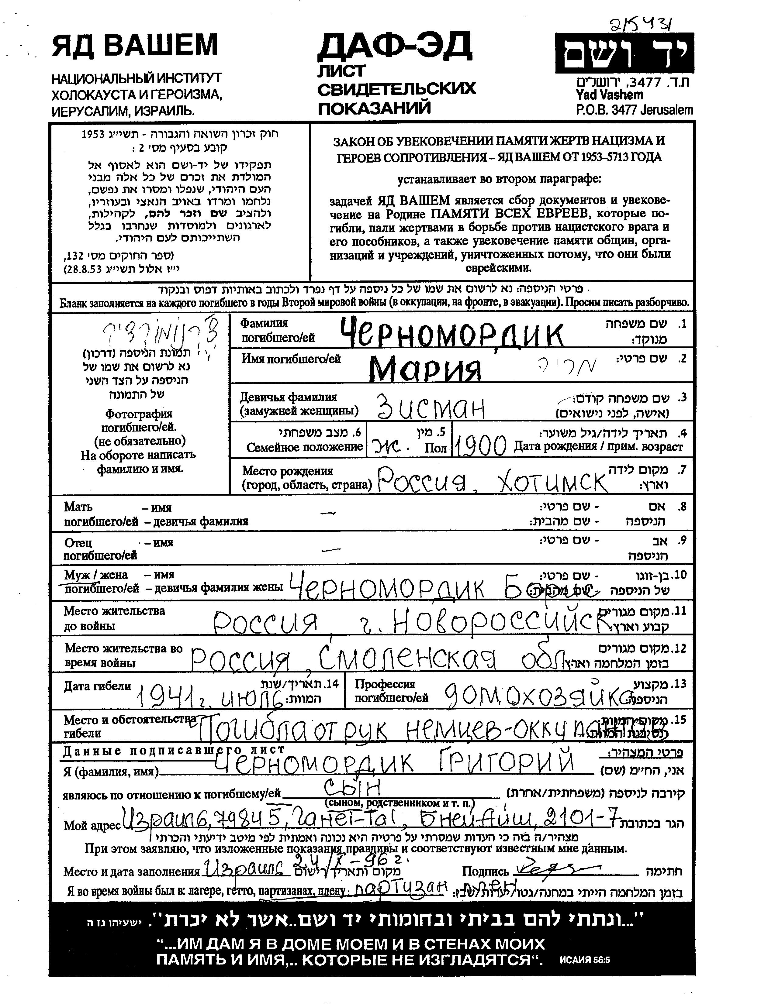 Maria Chernomordik nee Zisman was born in Khotimsk, Belorussia (USSR), 1900. She was a housewife and married to Boris. Prior to WWII she lived in Novorossiysk, Russia (USSR). During the war she was in Smolensk, Russia (USSR). Maria was murdered in the Shoah. Place of death: unknown, 1941.