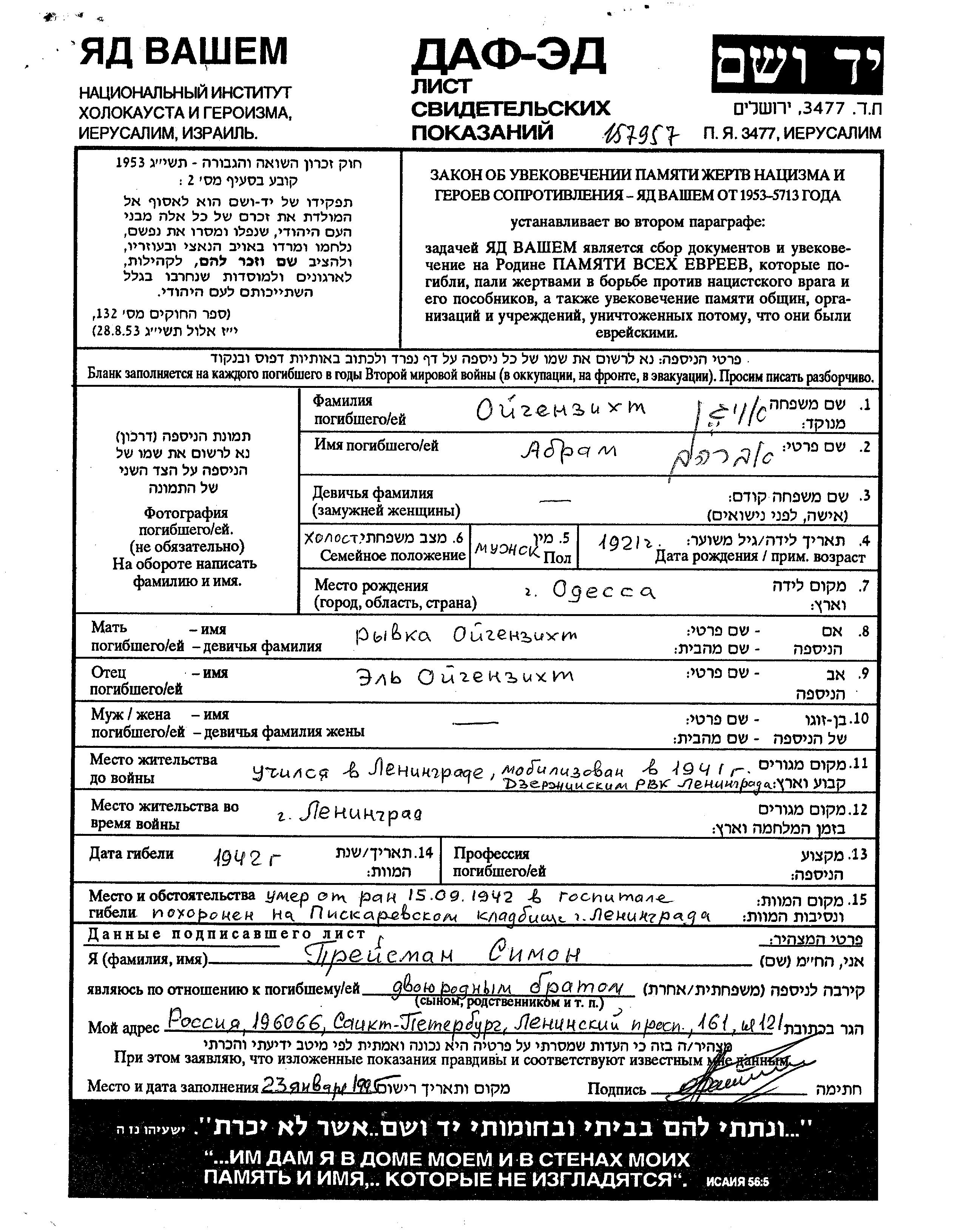 Oigenzikht Abram 1921 Leningrad, Russia (USSR) Page of Testimony