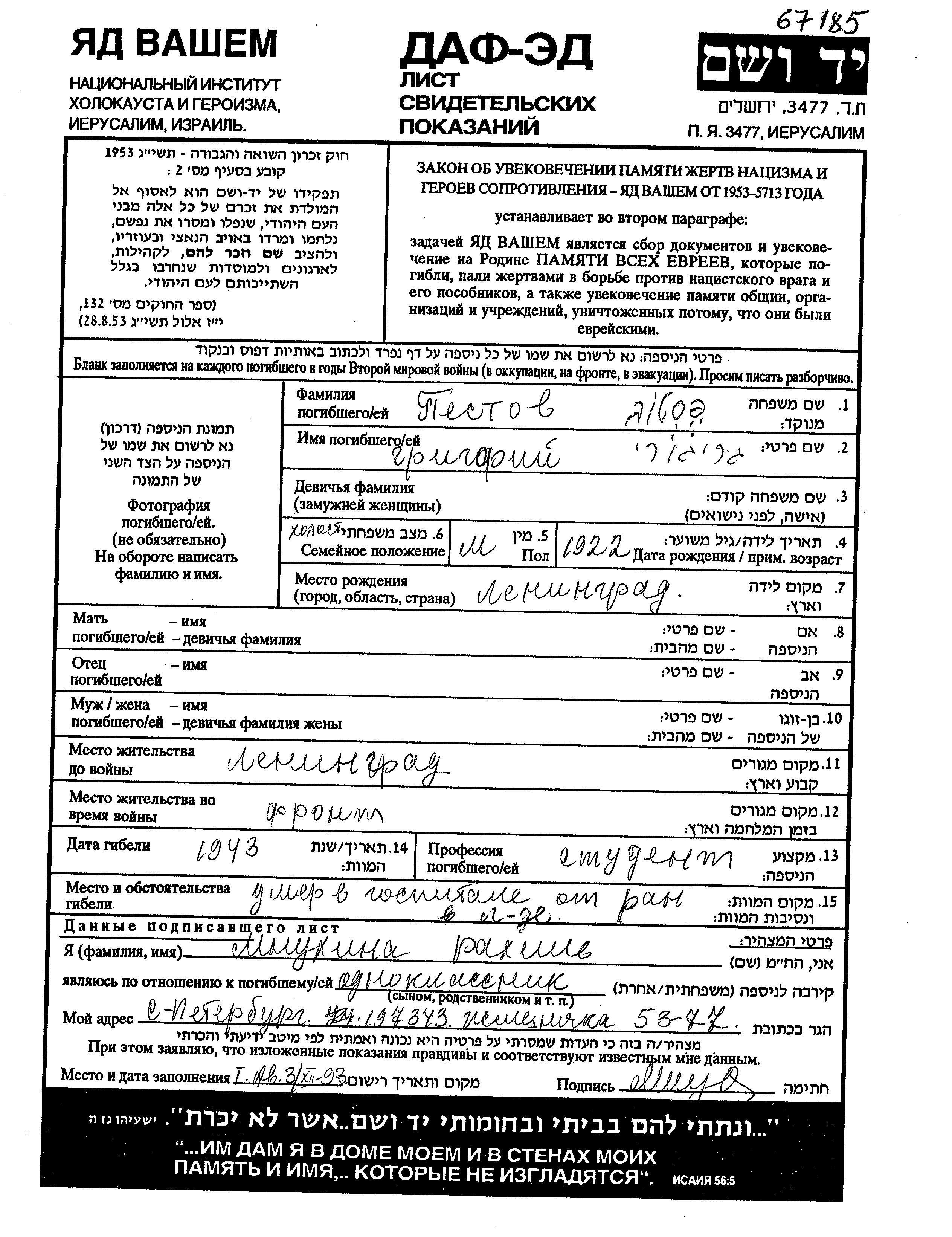 Grigori Pestov was born in Leningrad, Russia (USSR), 1922. He was a student and single. Prior to WWII he lived in Leningrad, Russia (USSR). During the war he was in the Soviet armed forces. Grigori was killed in military service in WWII. Place of death: unknown, 1943.