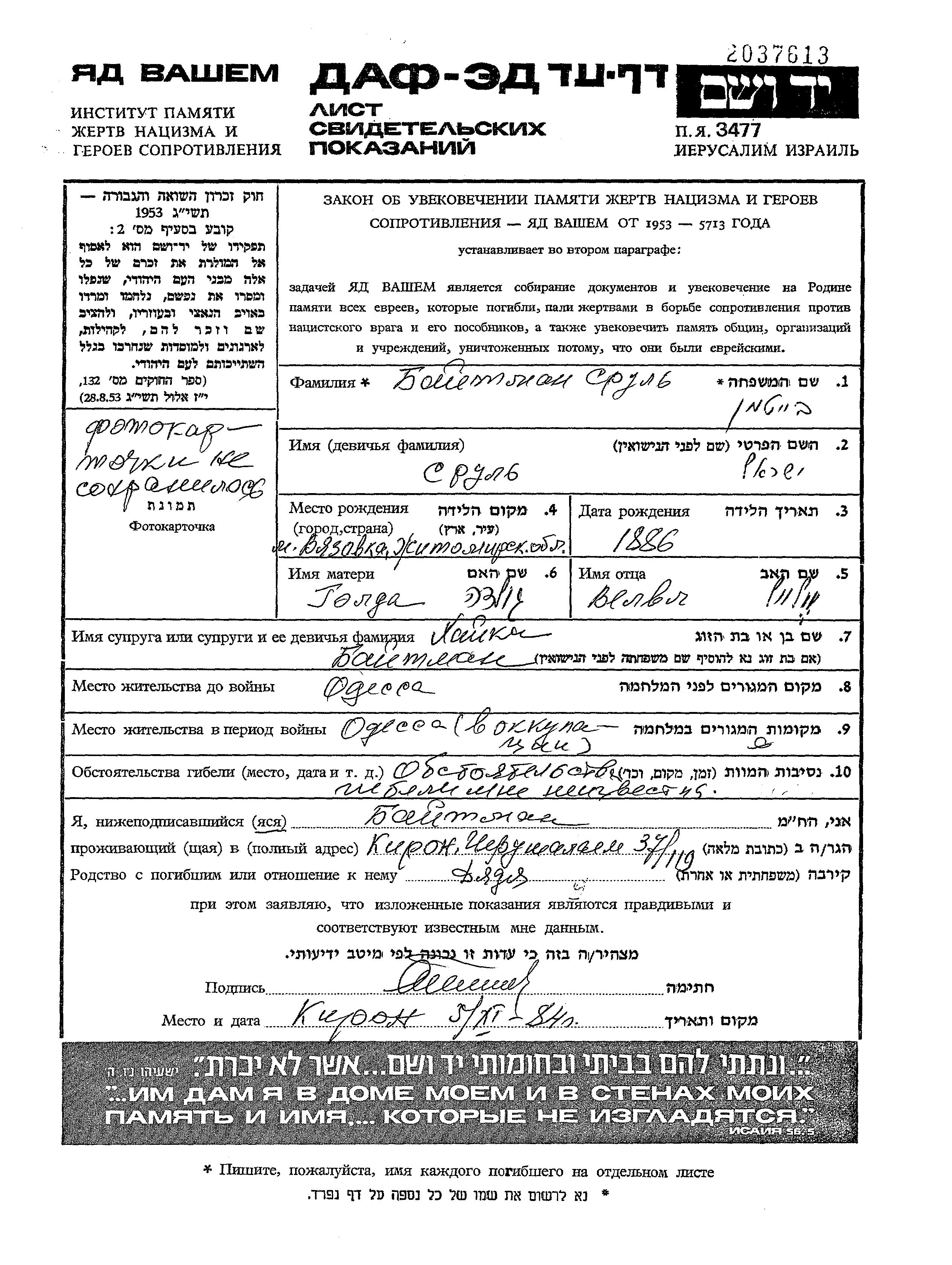 Baitman Srul 1886 Odessa, Ukraine (USSR) Page of Testimony