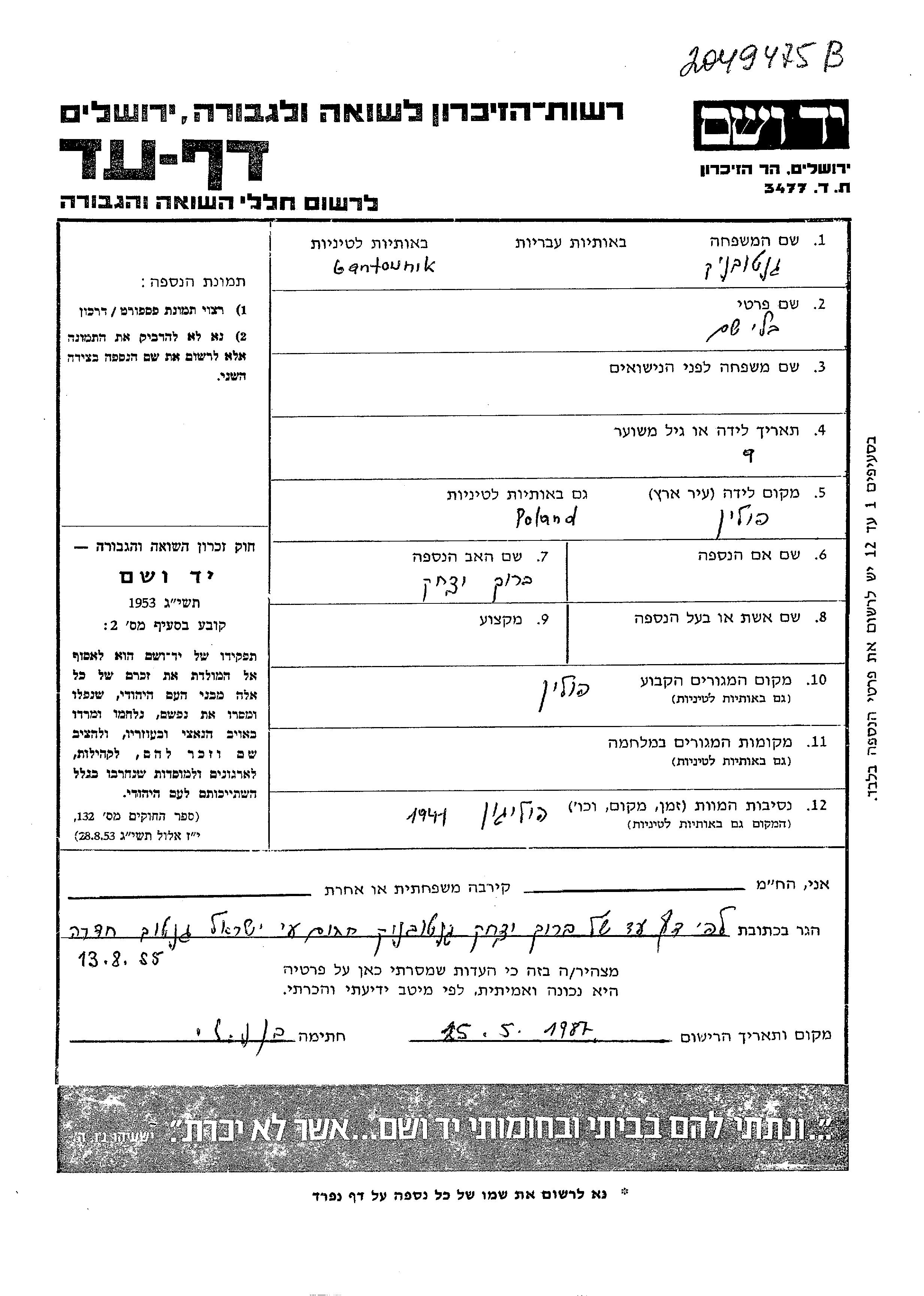 First name unknown Gantownik was born in Poland to Baruch Yitzkhak. Was child. Prior to WWII lived in Stojaciszki, Poland. During the war was in Stojaciszki, Poland. Was murdered in the Shoah. Place of death: Poligon, Murder Site, 1941.