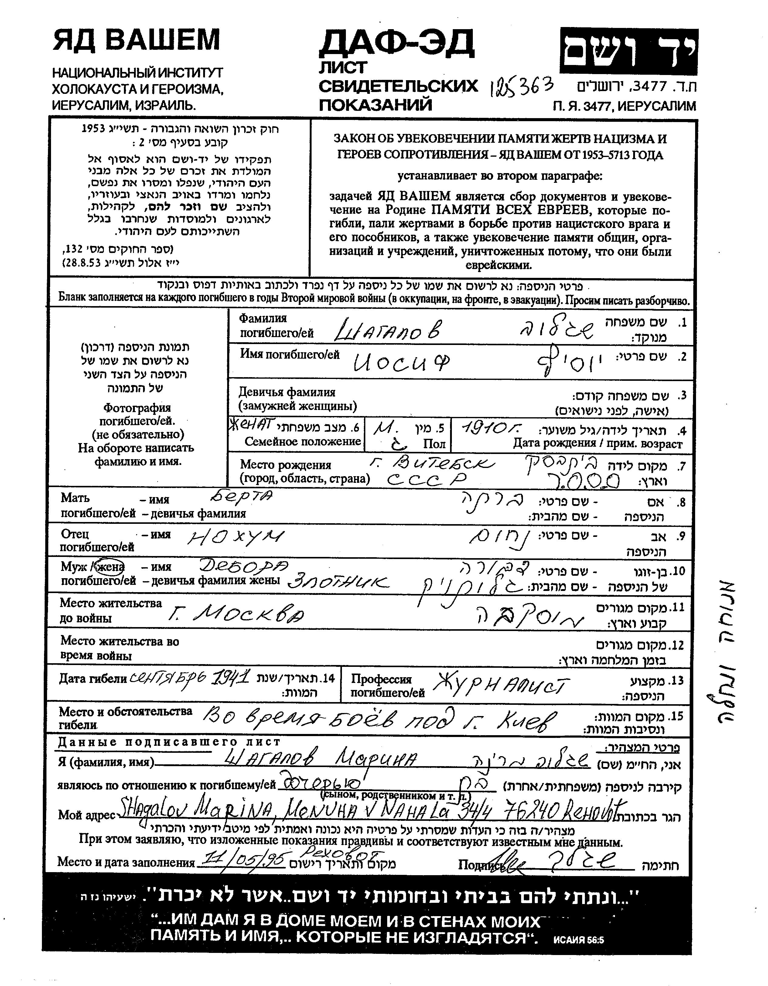 Iosif Shagalov was born in Vitebsk, Belorussia (USSR), 1910 to Nokhum and Berta. He was a journalist and married to Debora. Prior to WWII he lived in Moskva, Russia (USSR). During the war he was in the Soviet armed forces. Iosif was killed in military service in WWII. Place of death: Kiev, Ukraine (USSR), 1941.