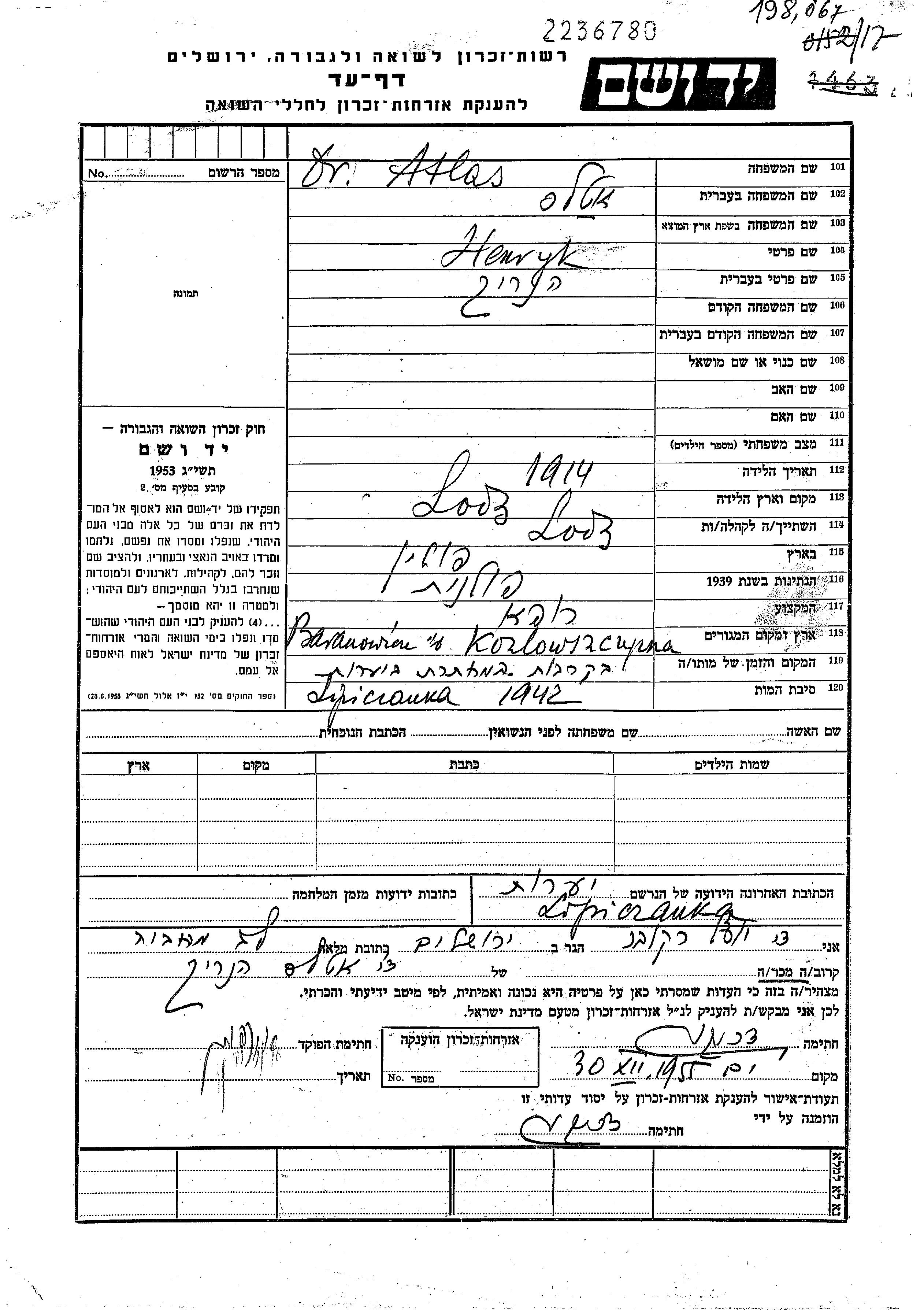 Dr. Henryk Atlas was born in Lodz, Poland, 1914. He was a physician. Prior to WWII he lived in Kozlowszczyzna, Poland. During the war he was in Kozlowszczyzna, Poland. Dr. Atlas was murdered in the Shoah. Place of death: Lipiczanka, Poland, 1942.