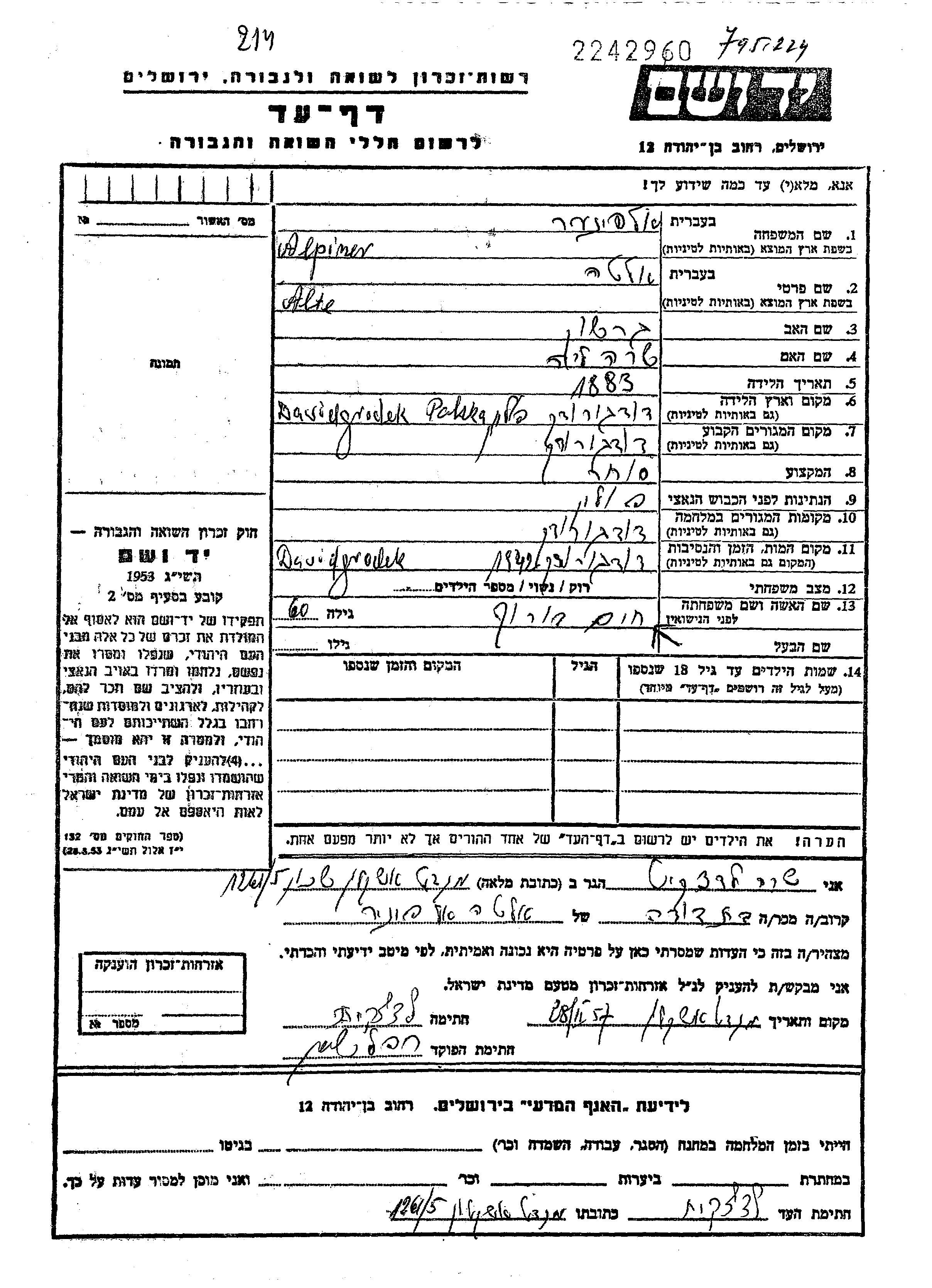 Alte Alpiner was born in Dawidgrodek, Poland, 1883 to Gershon and Sara Lea. She was a merchant and married to Borukh Khaim. Prior to WWII she lived in Dawidgrodek, Poland. During the war she was in Dawidgrodek, Poland. Alte was murdered in the Shoah. Place of death: Dawidgrodek, Poland, 1942.