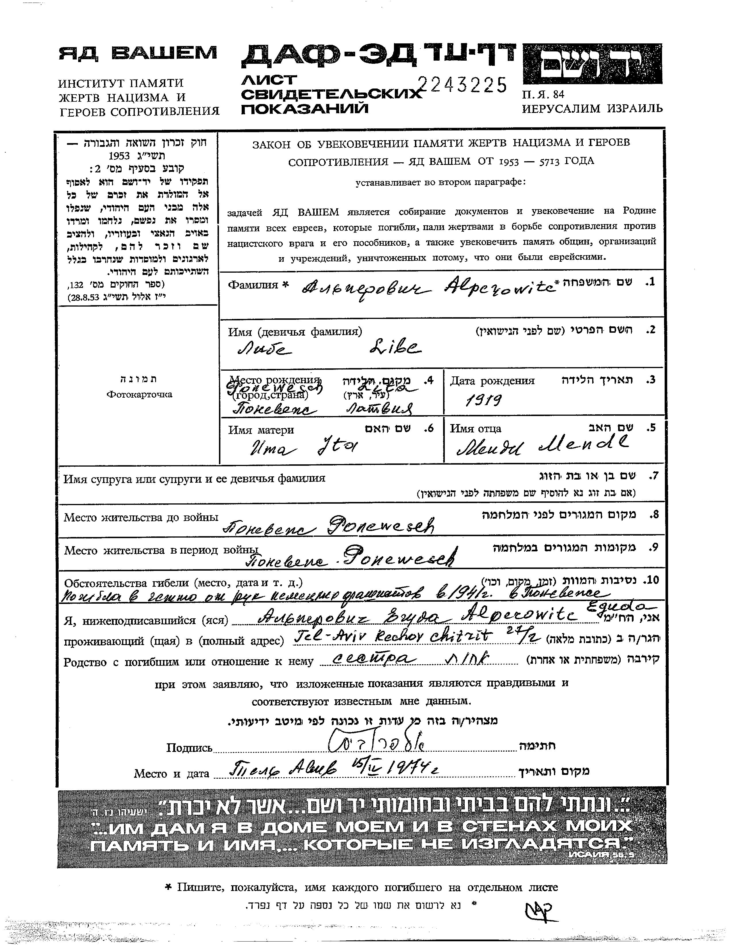 Alperowitc Liba 1919 Ponevetz, Lithuania Page of Testimony