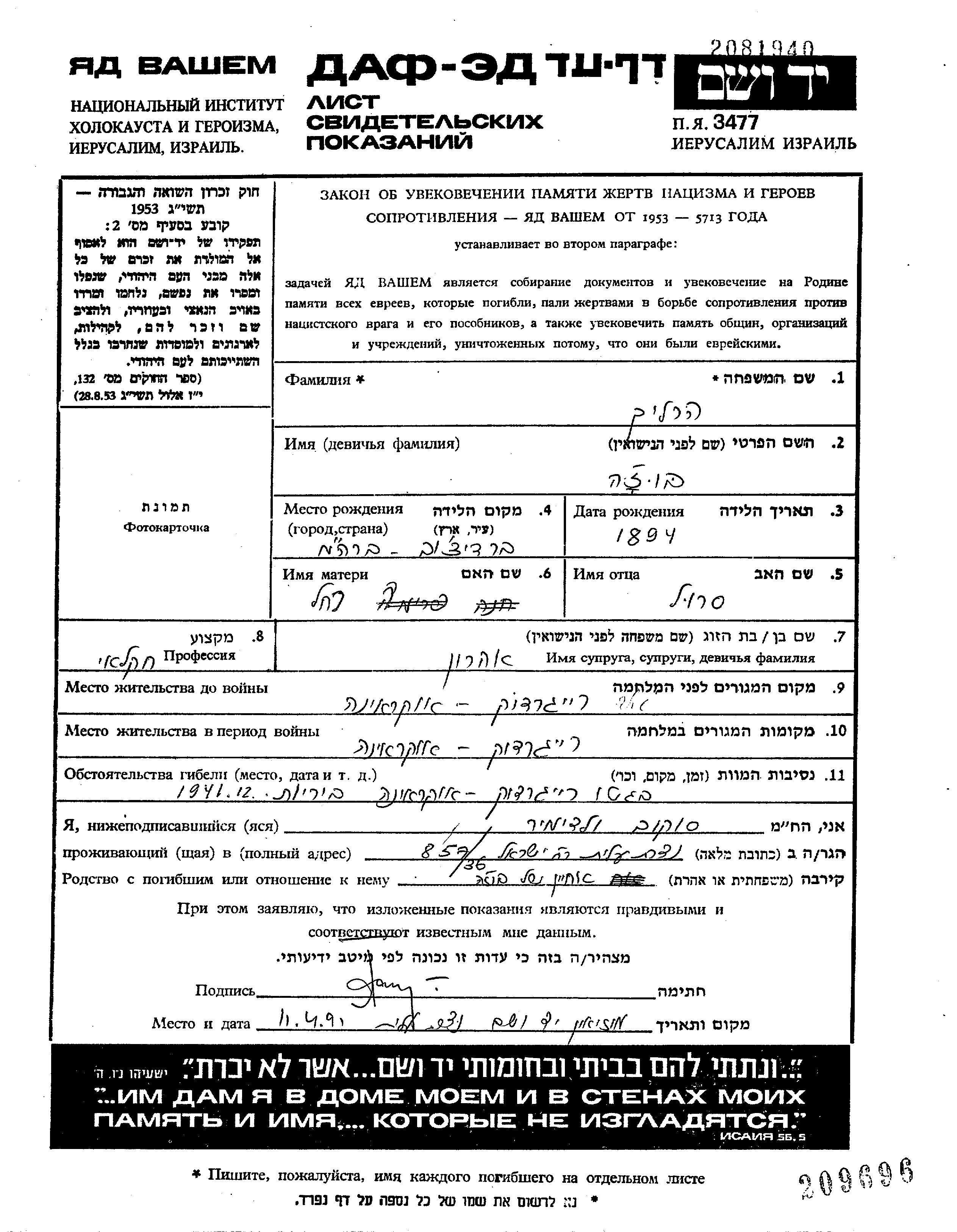 Buzha Buzia Herlikh was born in Berdichev, Ukraine (USSR) to Srul and Rakhel. He was an agriculturist and married to Aharon. Prior to WWII he lived in Raigorodok, Ukraine (USSR). During the war he was in Raigorodok, Ukraine (USSR). Buzha Buzia was murdered in the Shoah. Place of death: Raigorodok, Ukraine (USSR).