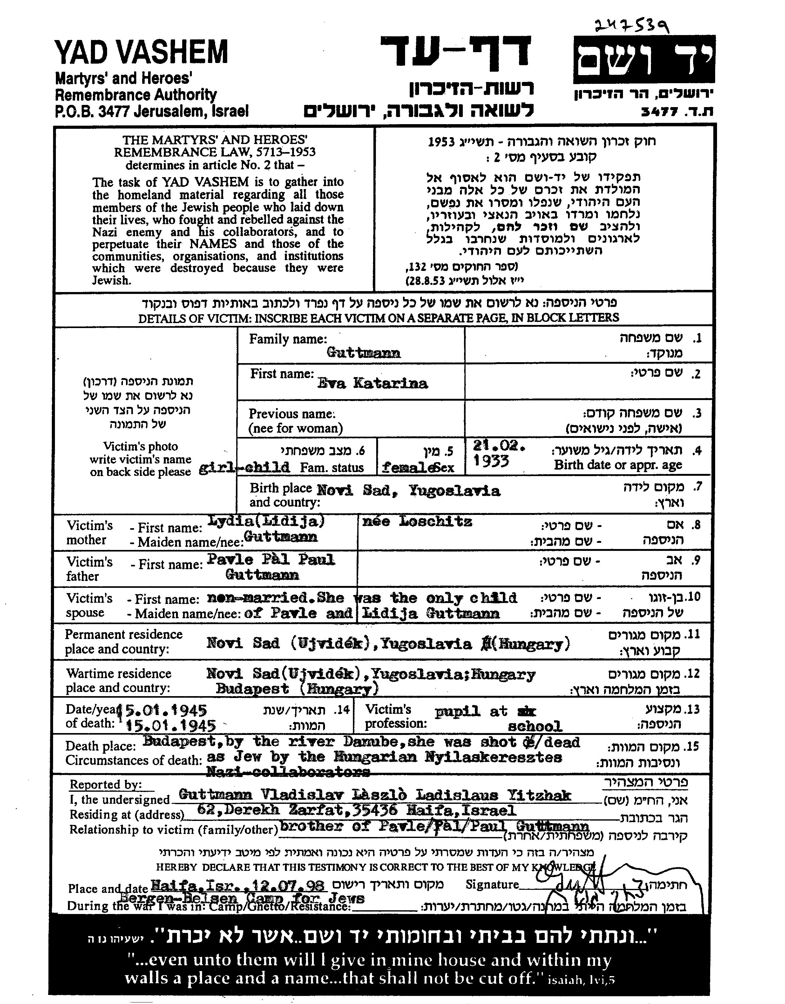 Guttmann Katarina Eva 1933 Novi Sad, Yugoslavia Page of Testimony