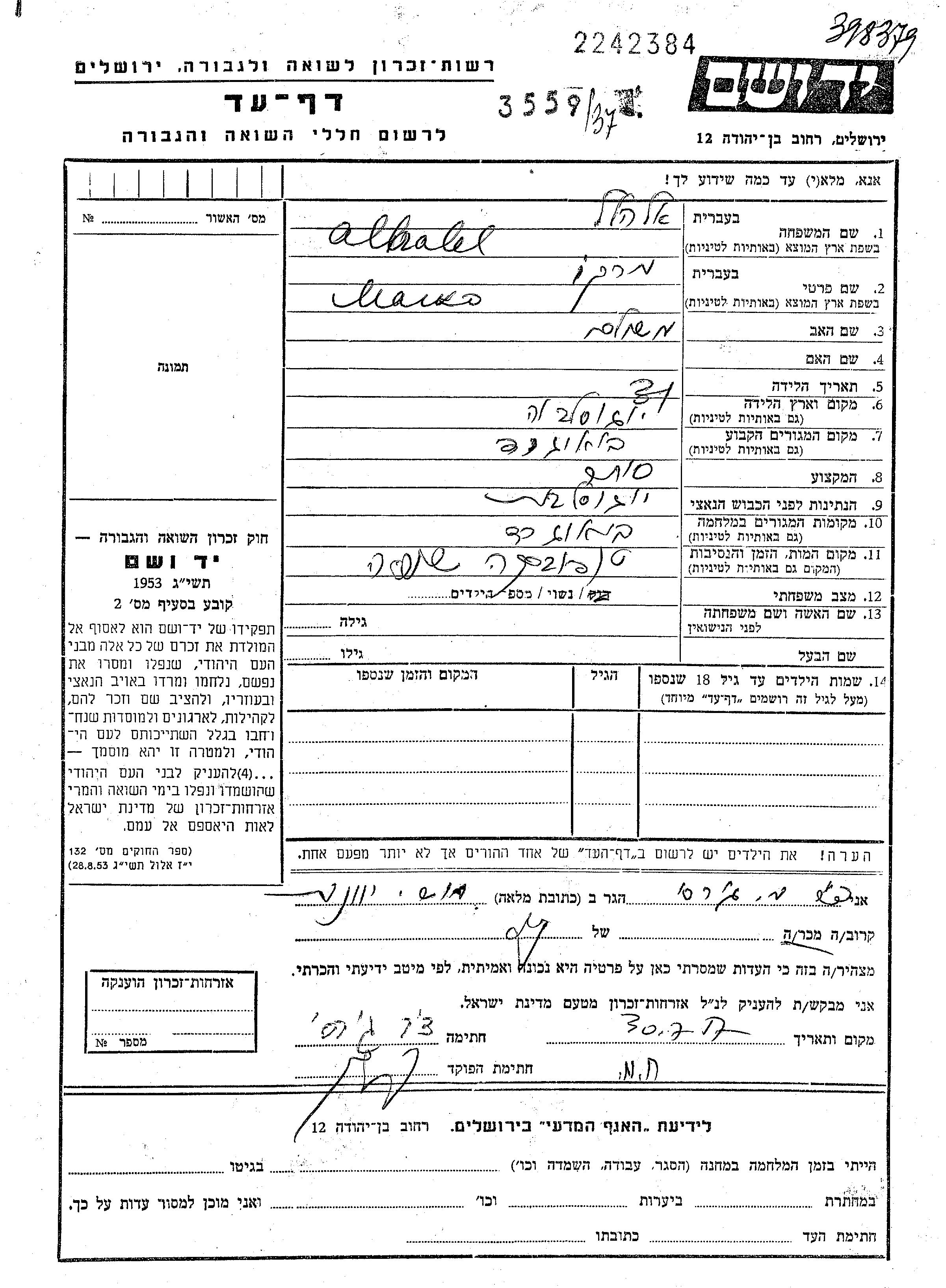 Marko Alhalel was born in Yugoslavia to Meshulam. He was a merchant and married. Prior to WWII he lived in Beograd, Yugoslavia. During the war he was in Beograd, Yugoslavia.