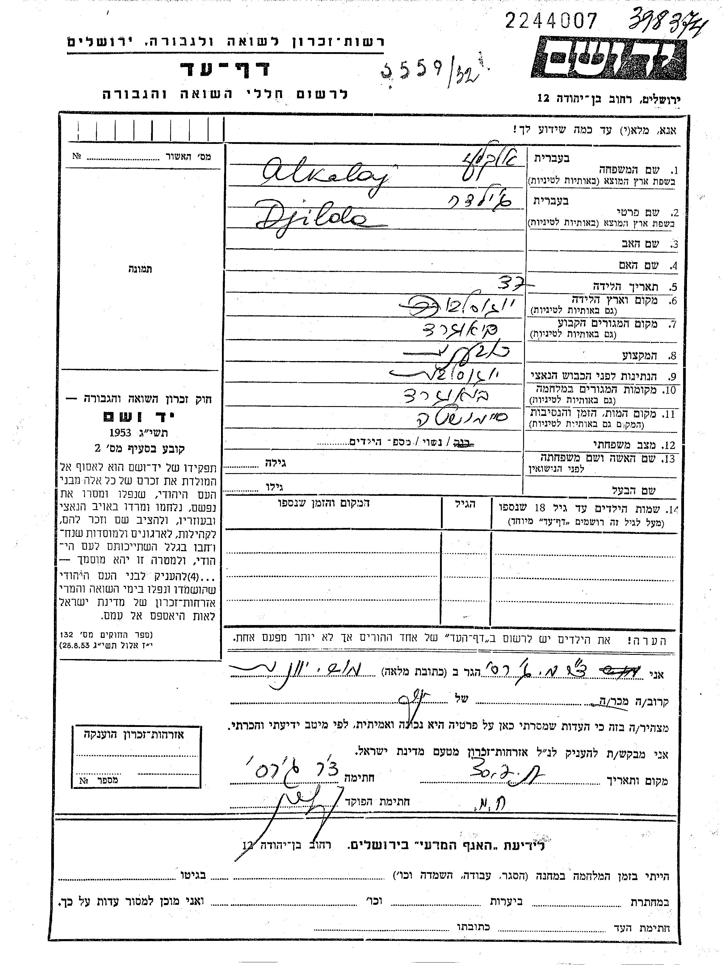Alkalaj Djilda Beograd, Yugoslavia Page of Testimony