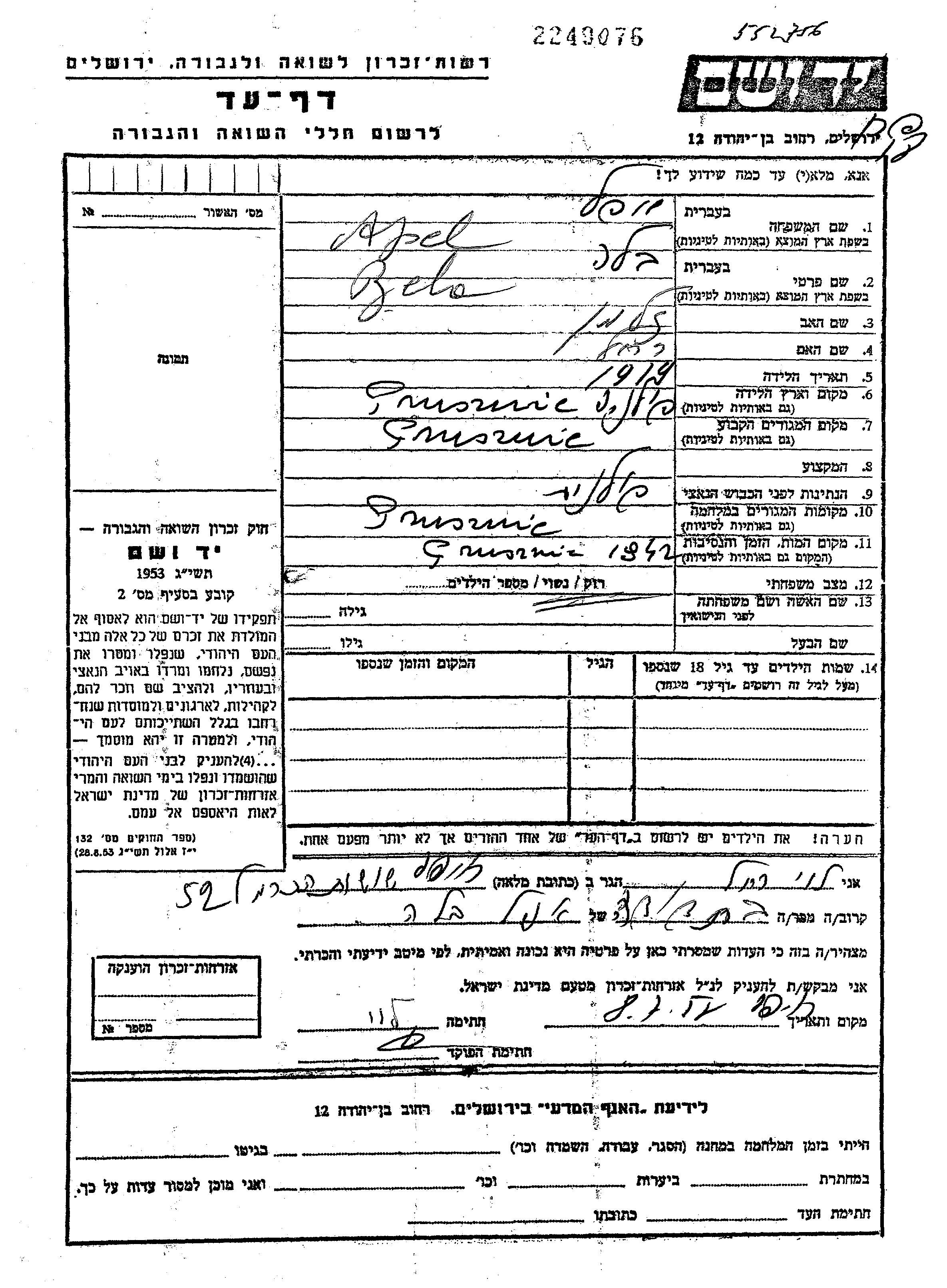Bela Apel was born in Pruzany, Poland, 1919 to Zalmen and Rachel. She was single. Prior to WWII she lived in Pruzany, Poland. During the war she was in Pruzany, Poland. Bela was murdered in the Shoah. Place of death: Pruzany, Poland, 1942.