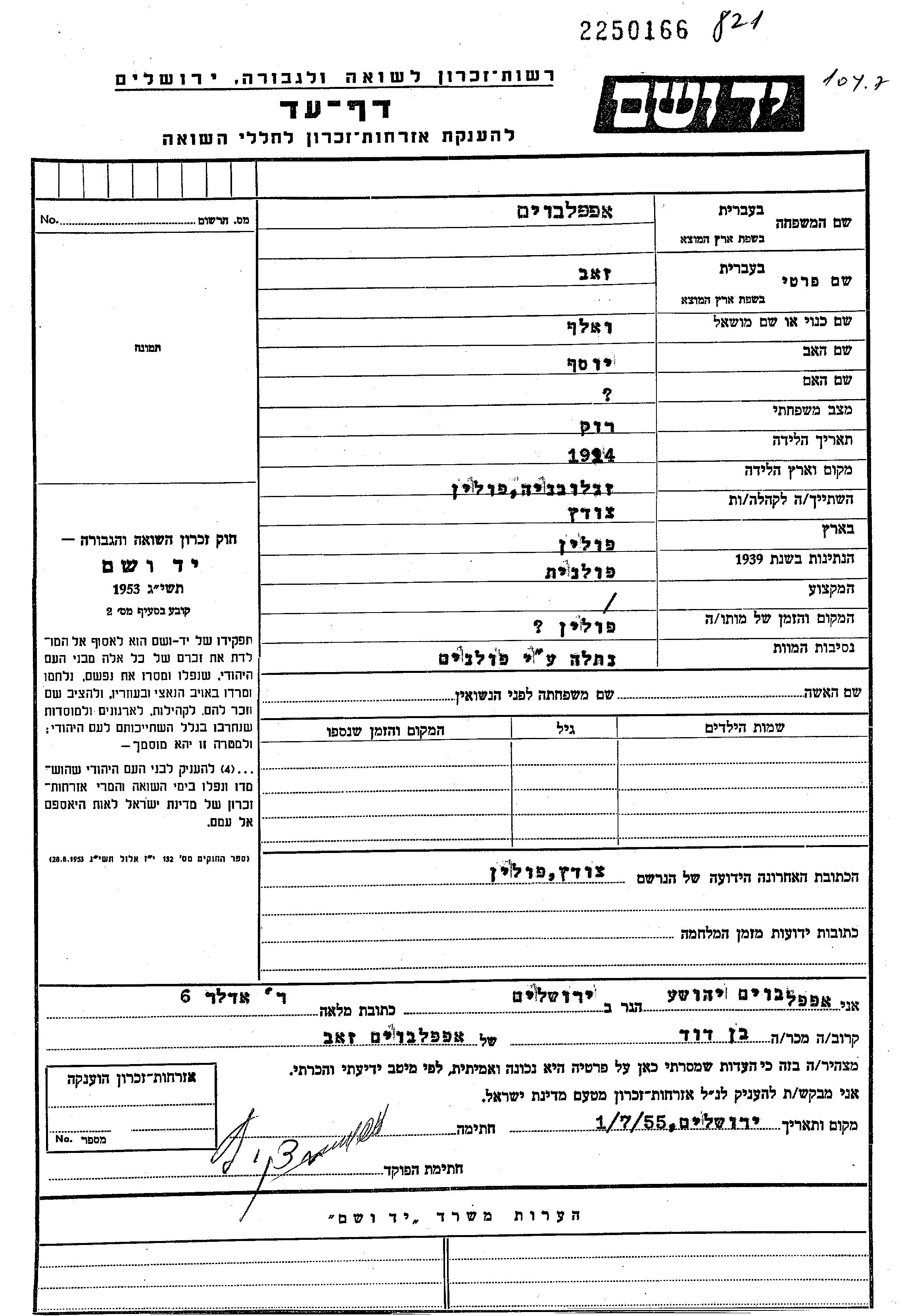 Wolf Zeev Appelboim was born in Zglobien, Poland, 1924 to Yosef. He was single. Prior to WWII he lived in Czudec, Poland. During the war he was in Poland. Wolf Zeev was murdered in the Shoah. Place of death: Poland.