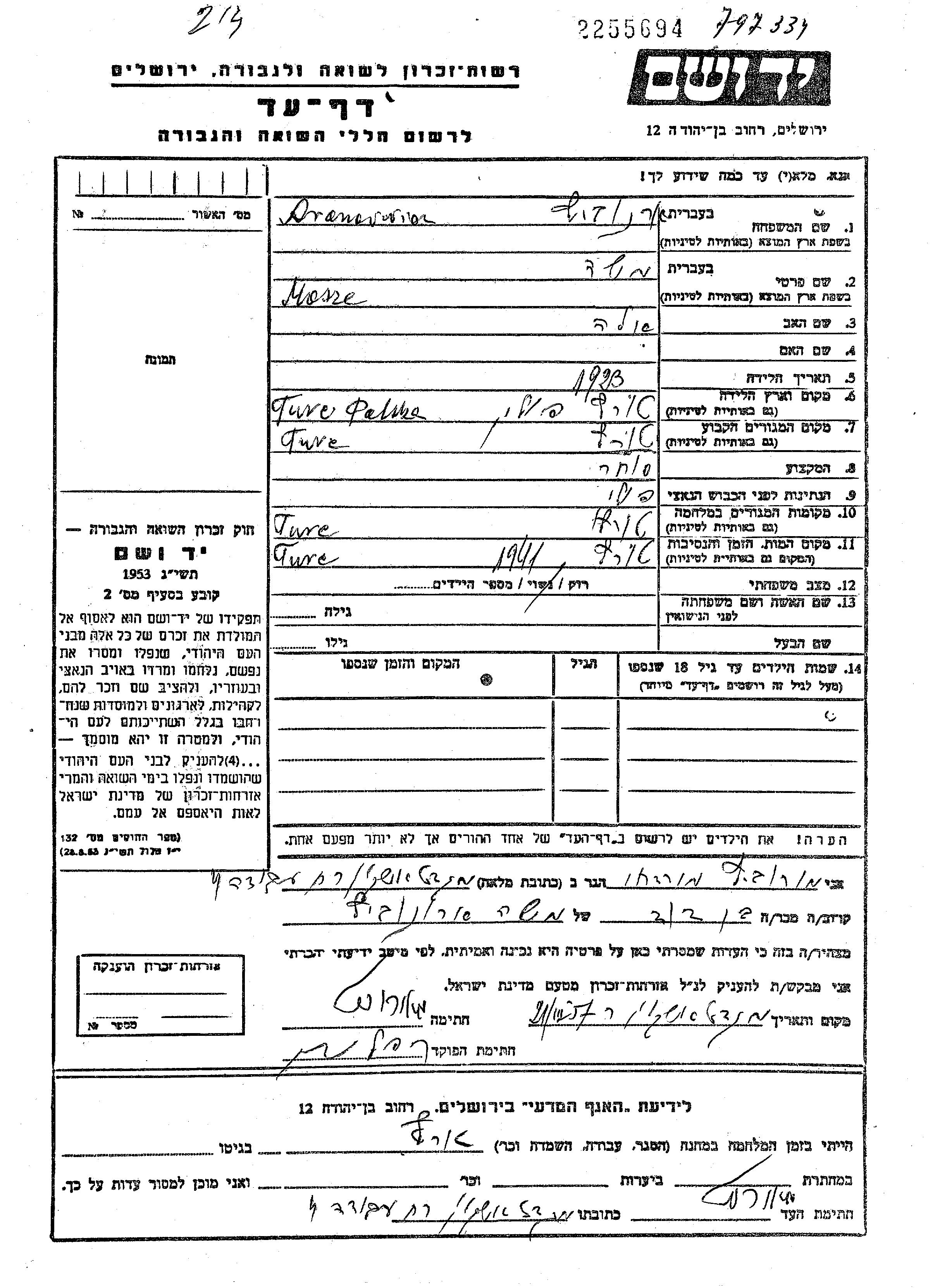 Mosze Aronowicz was born in Turetz, Poland, 1923 to Ela. He was a merchant and single. Prior to WWII he lived in Turetz, Poland. During the war he was in Turetz, Poland. Mosze was murdered in the Shoah. Place of death: Turetz, Poland, 1941.