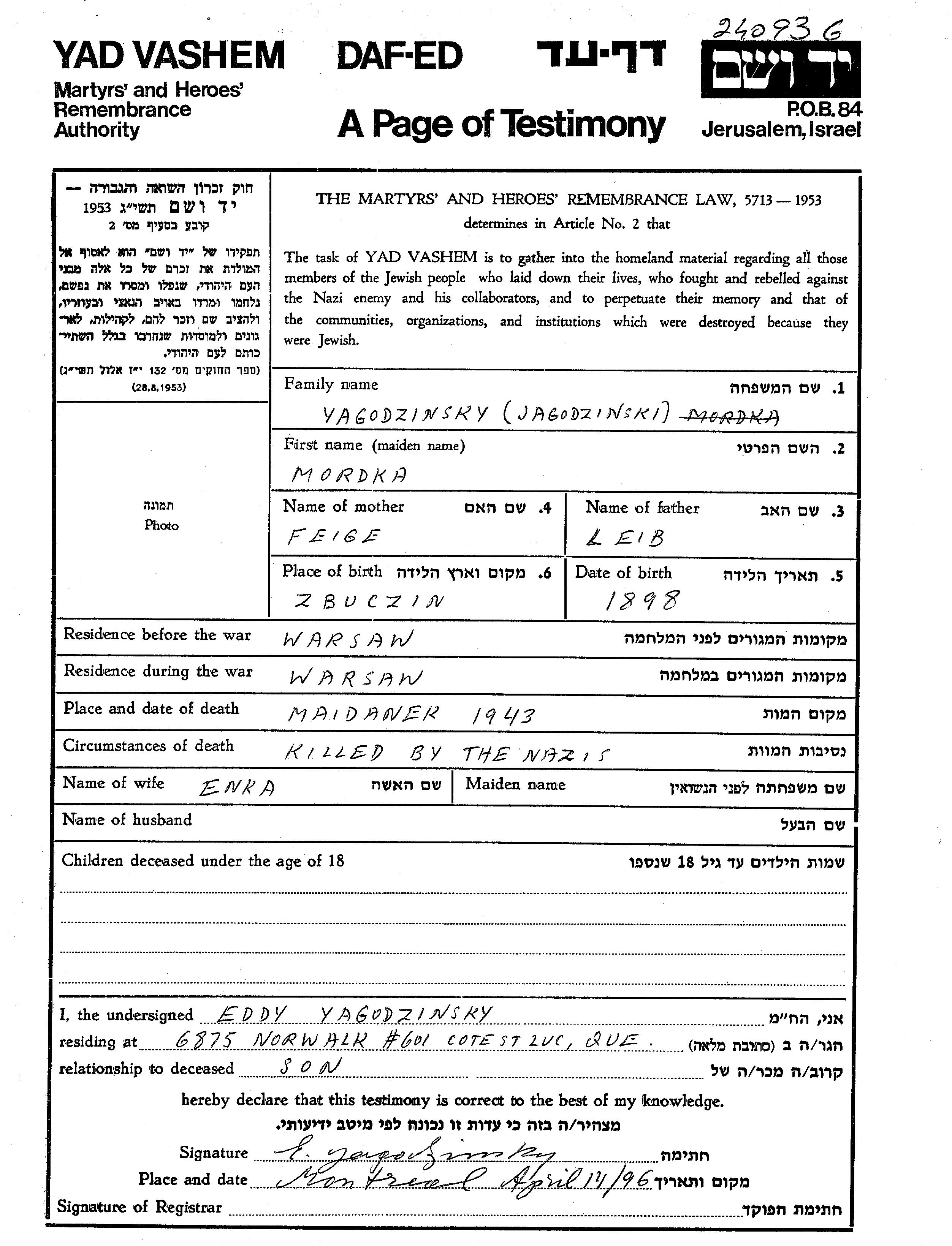 Jagodzinski Mordka 1898 Warszawa, Poland Page of Testimony