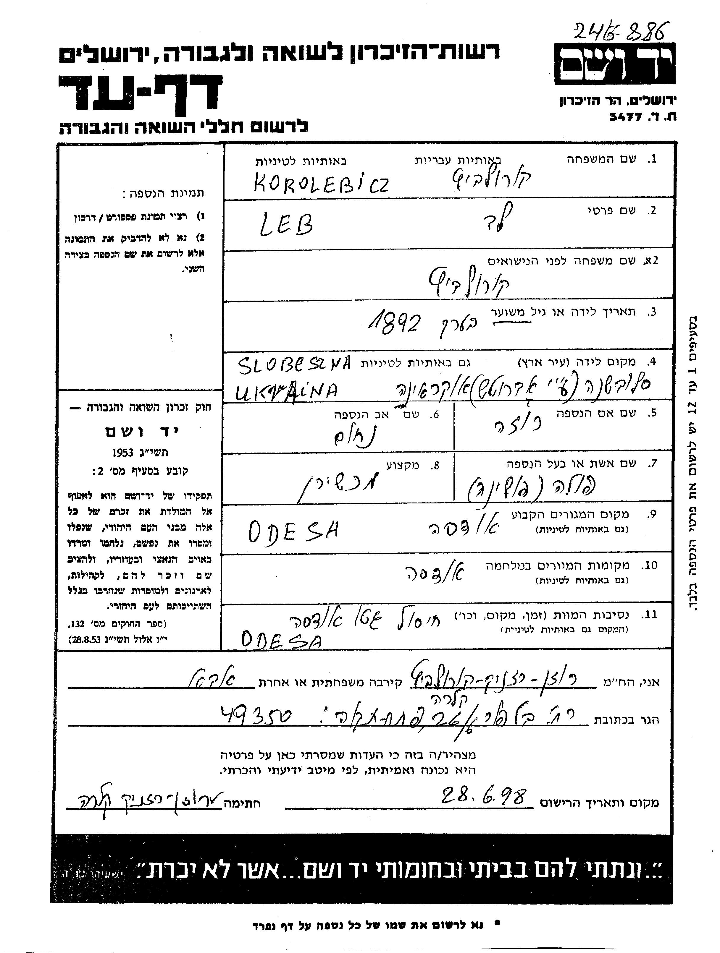 Leb Lev Korolewicz was born in Slovechno, Ukraine (USSR), 1892 to Nakhum and Roza. He was a technician and married to Pola. Prior to WWII he lived in Odessa, Ukraine (USSR). During the war he was in Odessa, Ukraine (USSR). Leb Lev was murdered in the Shoah. Place of death: Odessa, Ukraine (USSR).